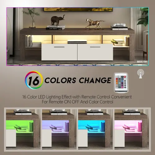 ·[Modern LED TV Stand]This LED TV stand features built-in LED lights,You can use the remote control to adjust the color and brightness of the light.16 light colors and 4 light changing modes.