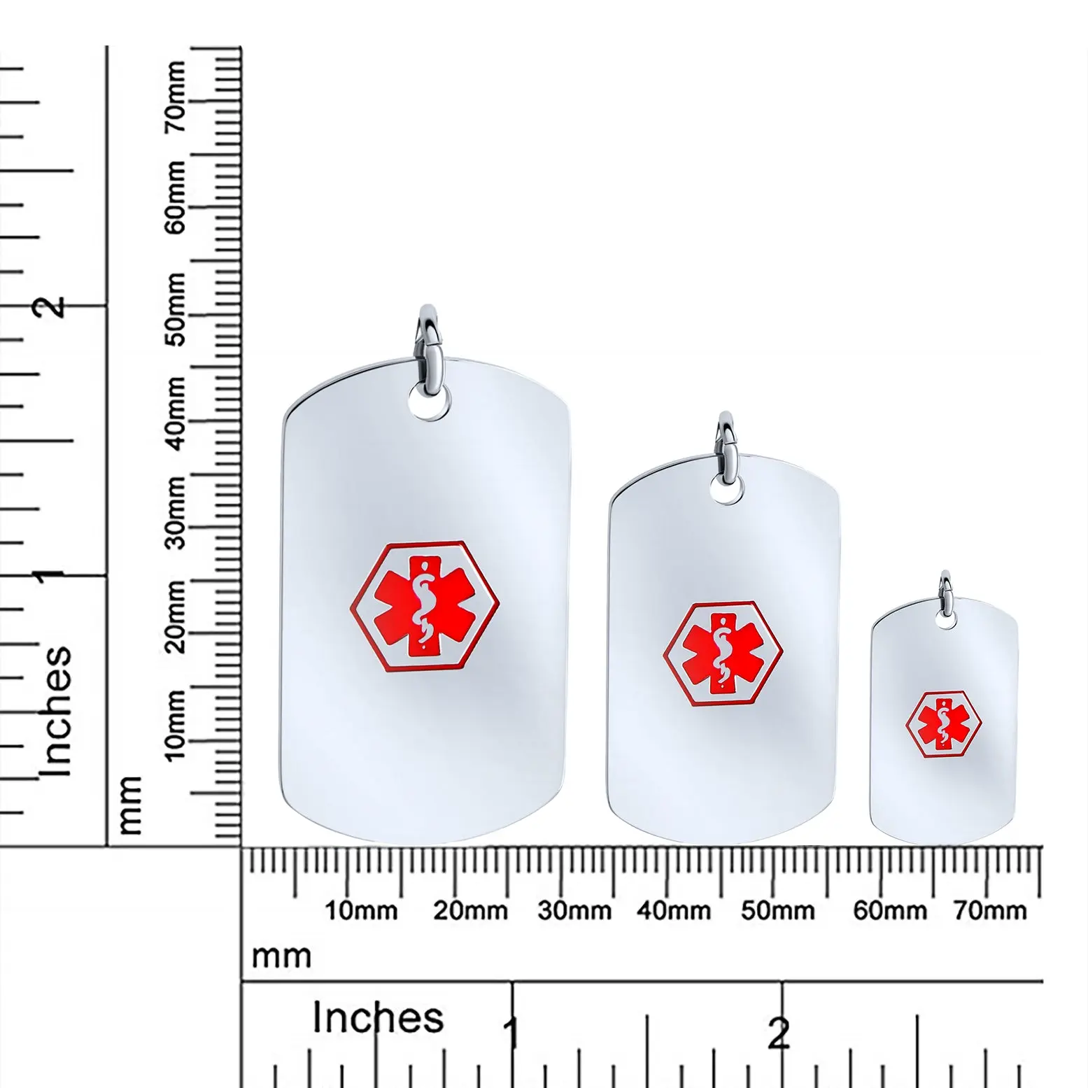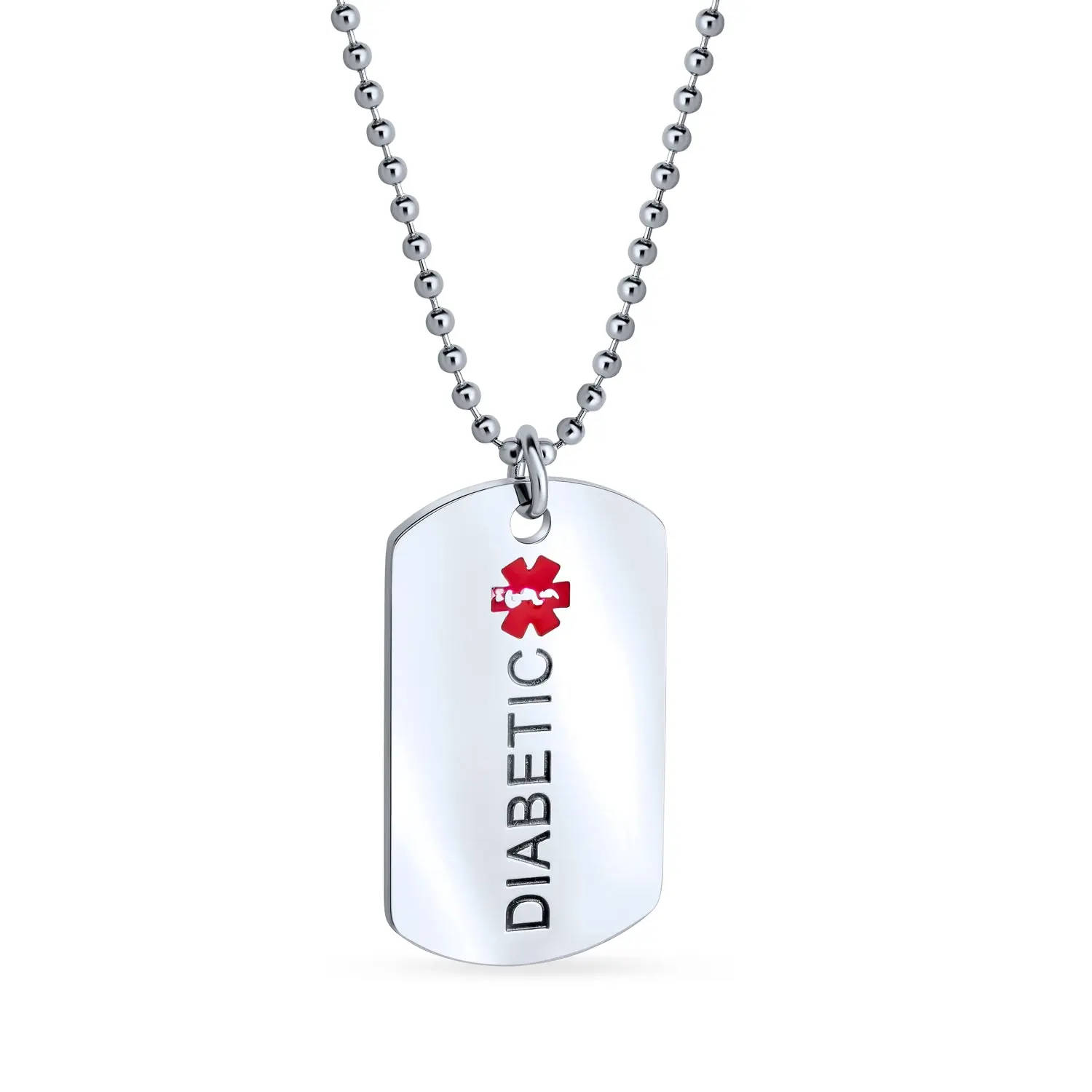 As a diabetic patient, awareness of sugar levels, diet, weight, and surroundings is crucial. A medical ID is essential for emergencies. This stylish Stainless Steel dog tag features a red enamel medical symbol. Unisex design with a 20-inch Stainless Steel ball chain. Affordable, life-saving jewelry piece.