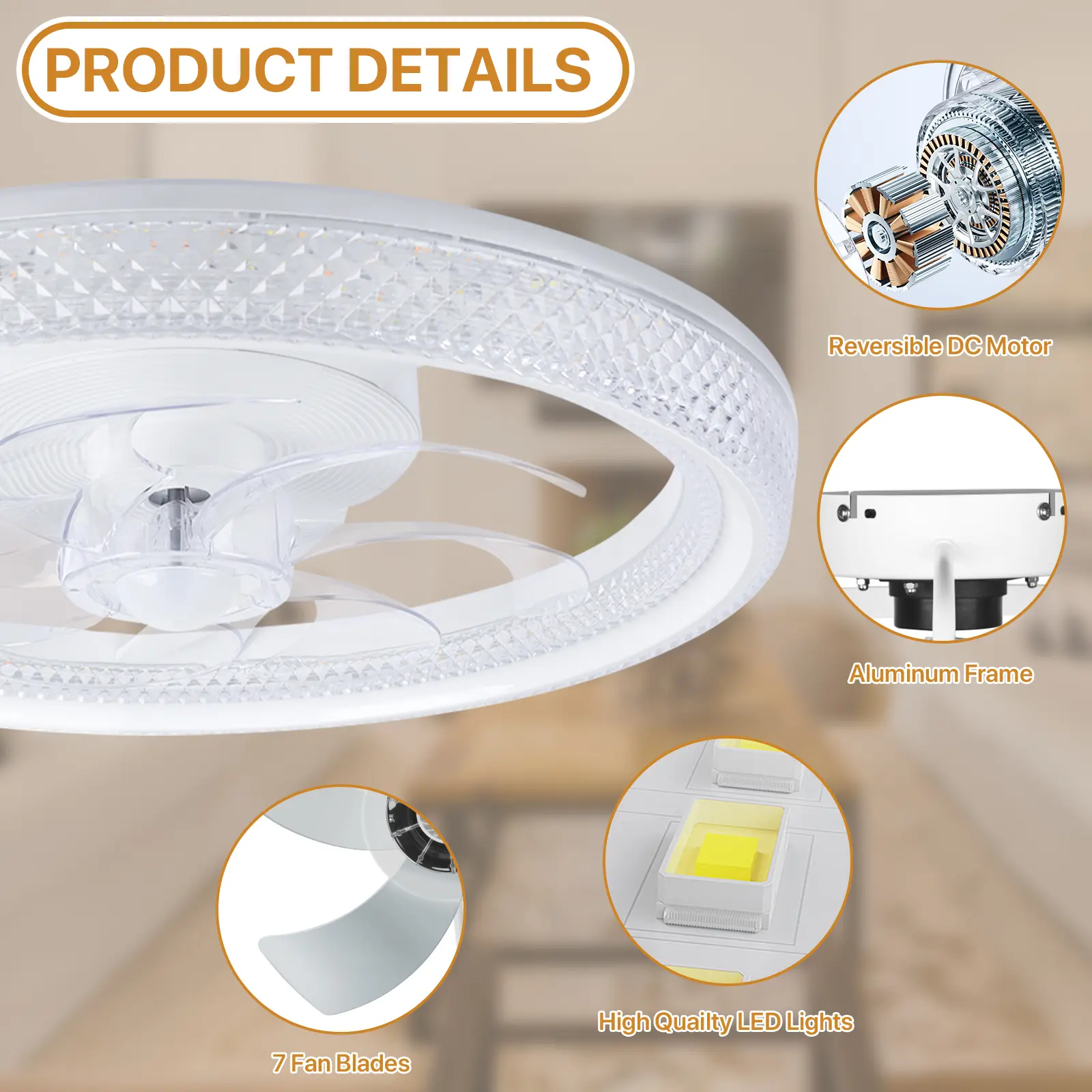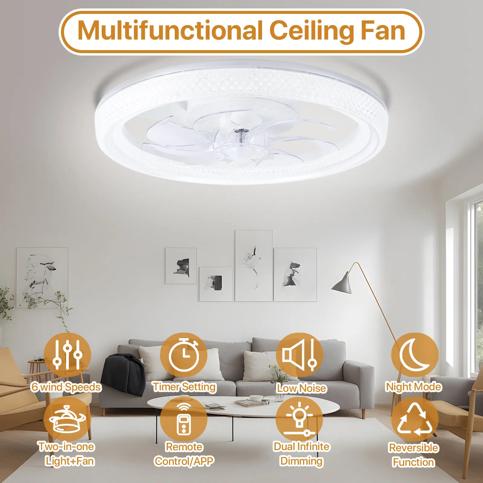 Integrate style and functionality with the Diamantes Smart Ceiling Fan. It combines a high-efficiency fan with a premium LED lighting system, saving space and meeting various needs. The fan features 7 silent blades and an aluminum frame for durability and stability. Choose from 3 color temperatures (3000K-6500K) to suit any ambiance. Enjoy stepless dimming for precise lighting control (20%-100%).