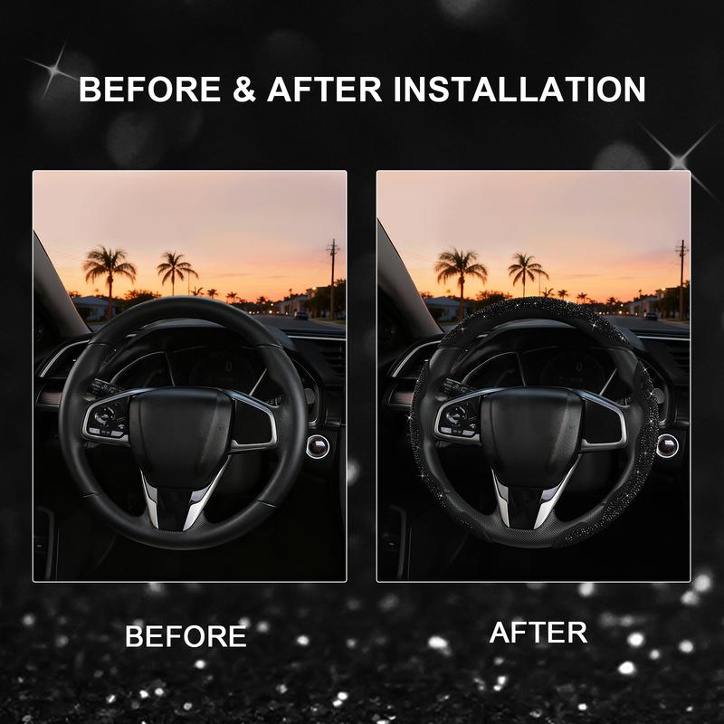 ABSOLUTELY LOVE IT!! It is so cute and sparkly. I have a D shaped steering wheel and I was able to still put all three pieces the regular way and it’s super cute and fit is super tight. It is made very well & stones all feel very secure.