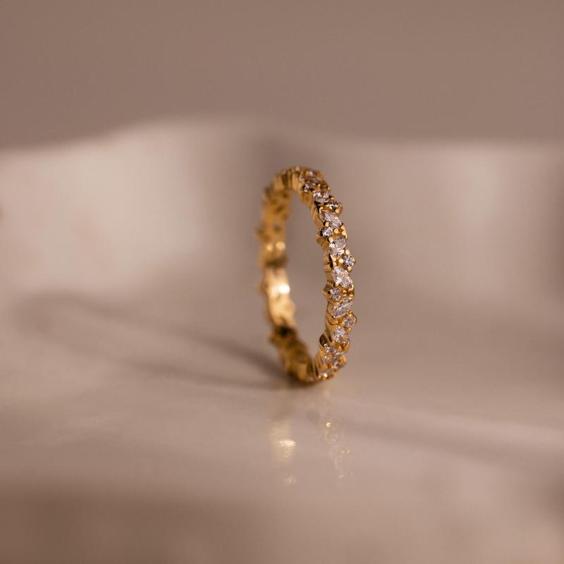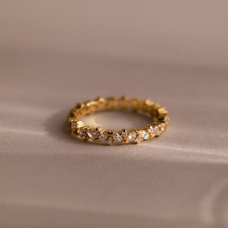 A timeless band with a contemporary edge, our Diamond Cluster Eternity Ring features a continuous row of round-cut stones in a clustered design that shimmers with every movement. Whether worn alone, stacked, or gifted for a milestone, this piece adds effortless shine to any look.
