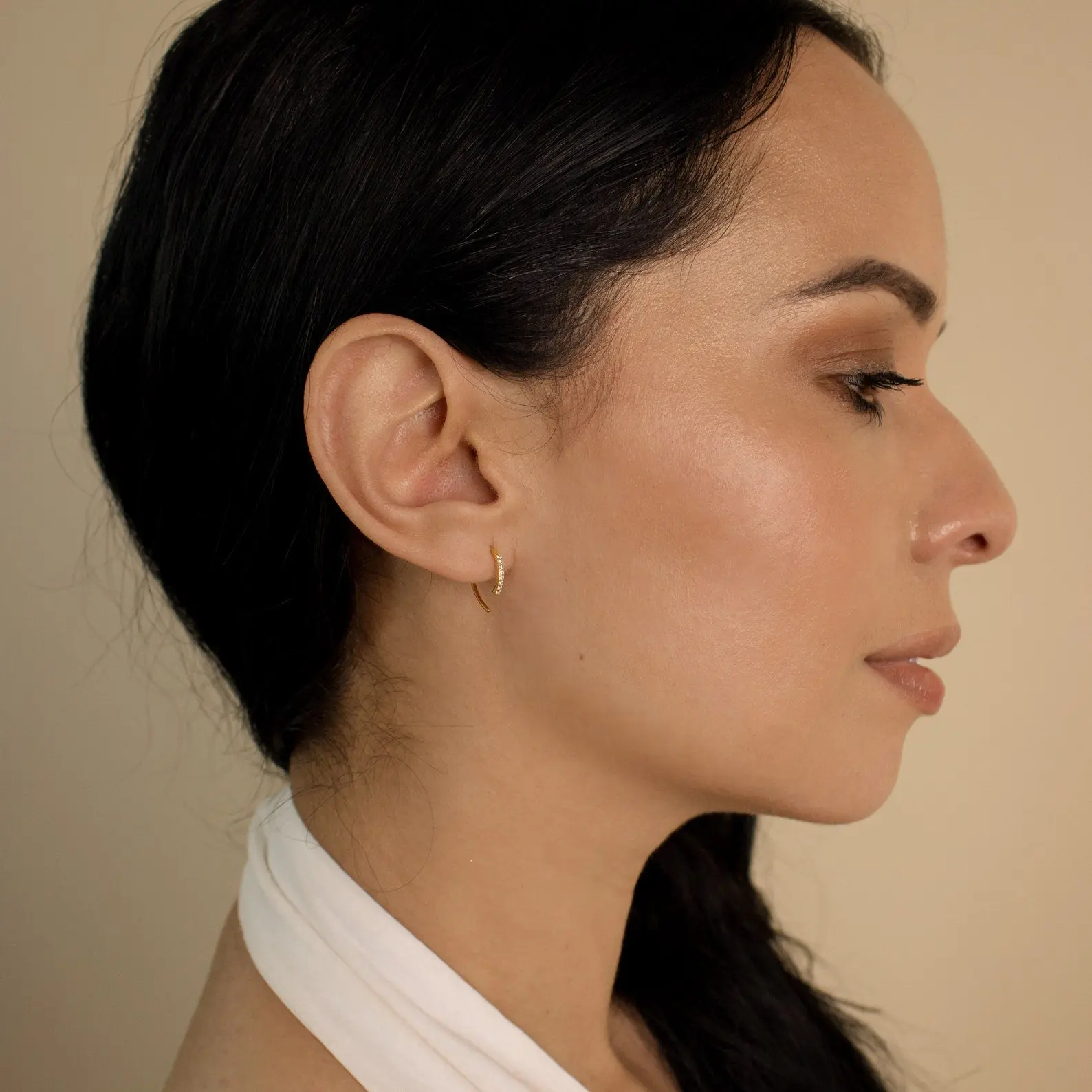 Minimalist yet modern, our Pave Wire Diamond Hoops is the definition of that. A dainty open-ended wire hoop encrusted with tiny diamonds that glisten in the light with every movement. This unique design hangs delicately on your lobes giving them a subtle glam.