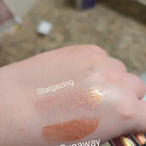 I was looking for glittery pink glosses and stargazing and runaway are perfect! It just depends on the vibe you want. Stargazing is lighter pink/less pigmented, but has more glitter/shimmer. Runaway is darker pink/more pigmented but a little less glittery with just pink/red glitters.