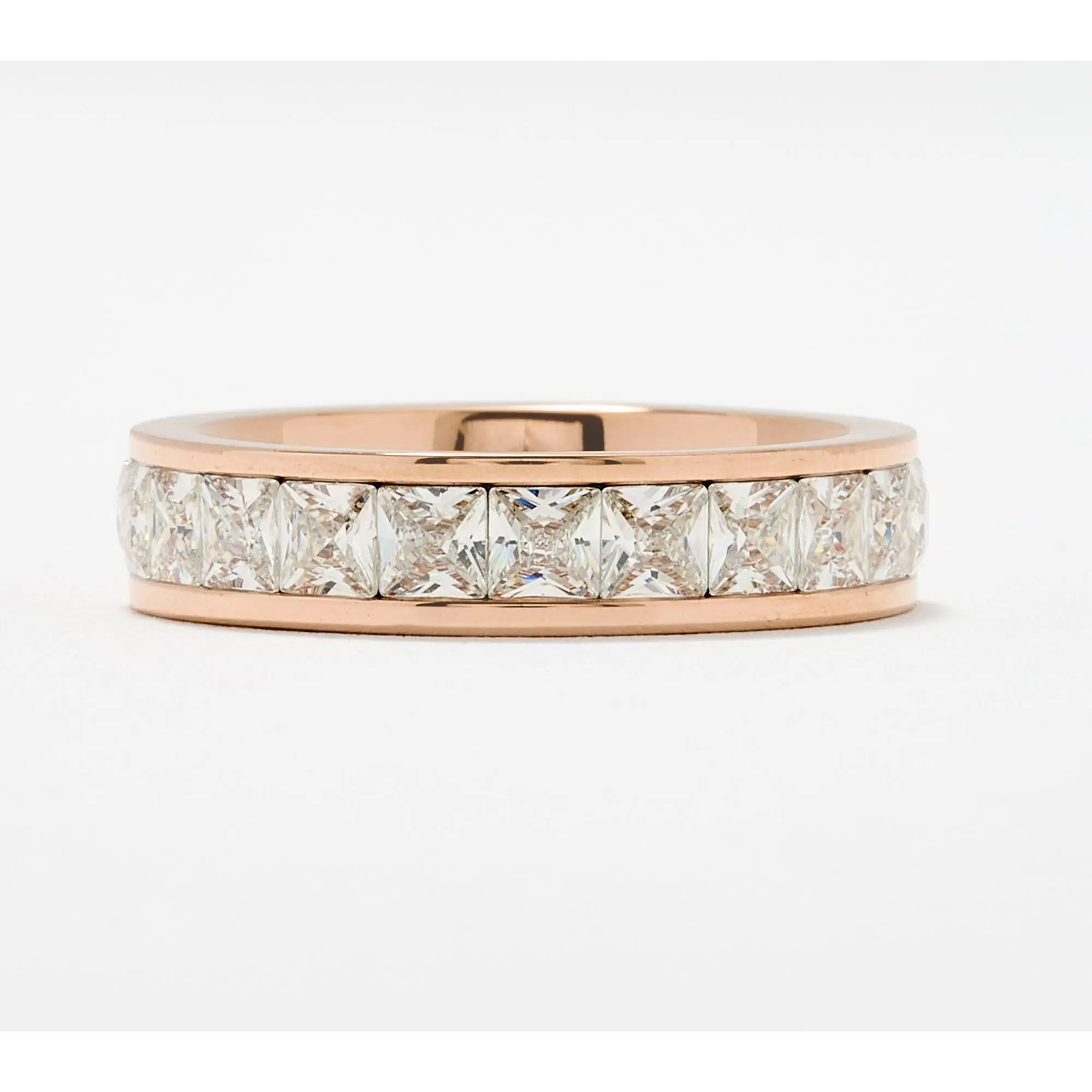 Steel by Diamonique Band Ring stainless steel, silvertone, goldtone, ros tone Plating. Polished clear CZ princess cut, 3.0 cttw to 3.75 cttw Ring sizes: 4, 5, 6, 7, 8, 9, 10 ,11 Measures: 3/16" x 1/8" Boxed Imported