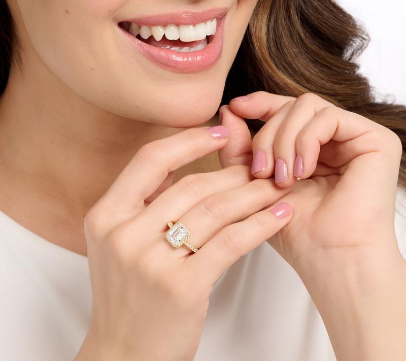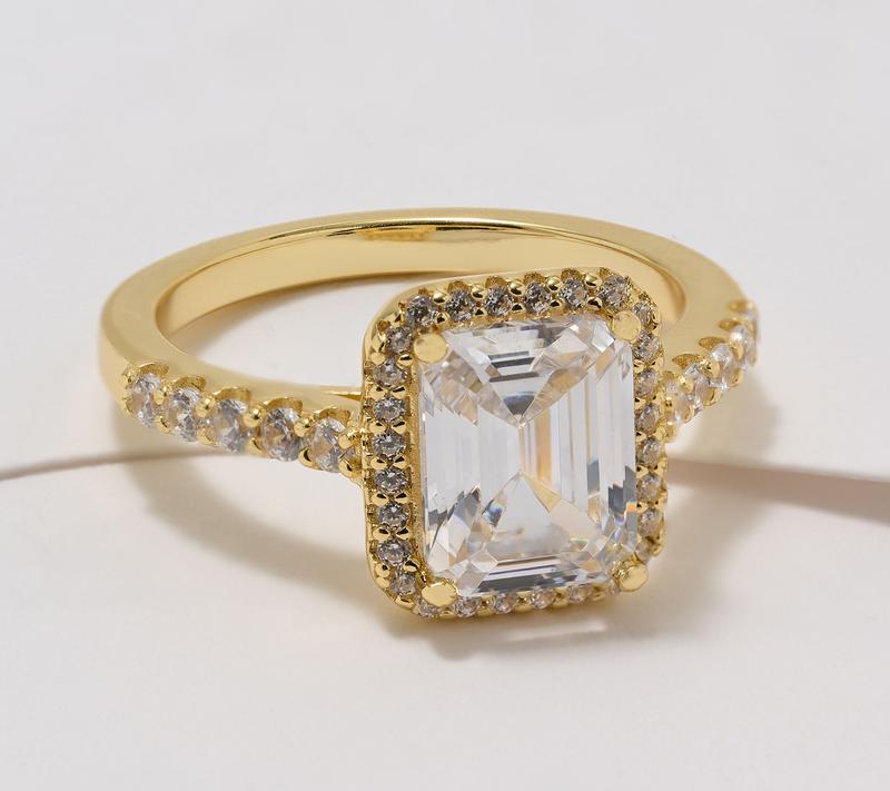 Let your style shine with the timeless elegance of this stunning ring. With its halo of round Diamonique simulated diamonds and bold emerald-cut center, it creates a dazzling focal point for any fashion statement.