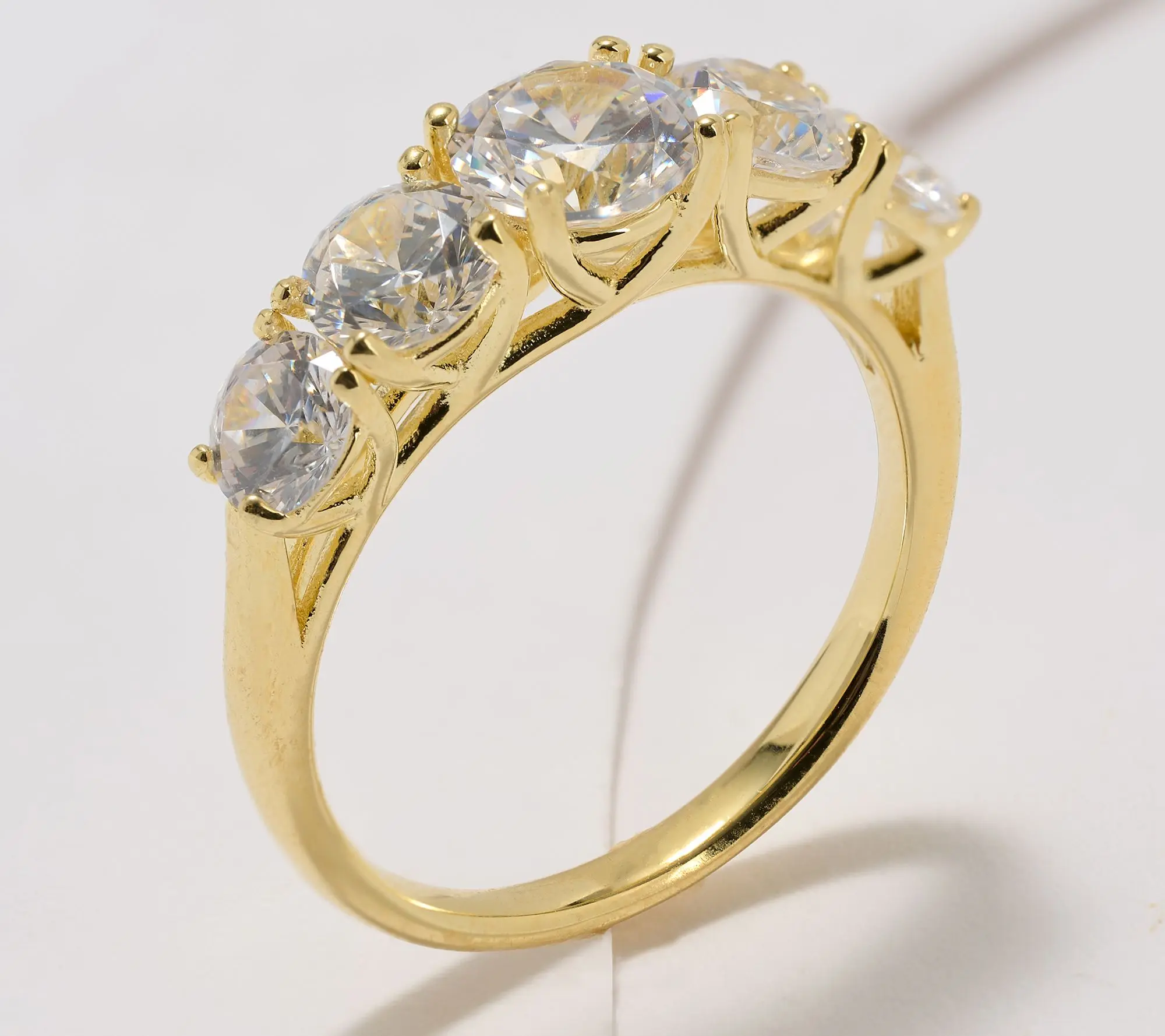 Diamonique Classic 5 Stone Ring Sterling Silver w/Choice Rhodium or 14K Yellow Gold Plating. Polished Round, White, CZ Stones, DE cttw:2.6 Actual CZ weight: 3.88 Ring sizes: 4, 5, 6, 7, 8, 9, 10 ,11 Measures: 1/4 L * 7/8 W * 1/4 H Imported.