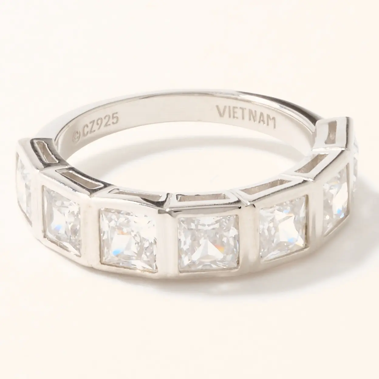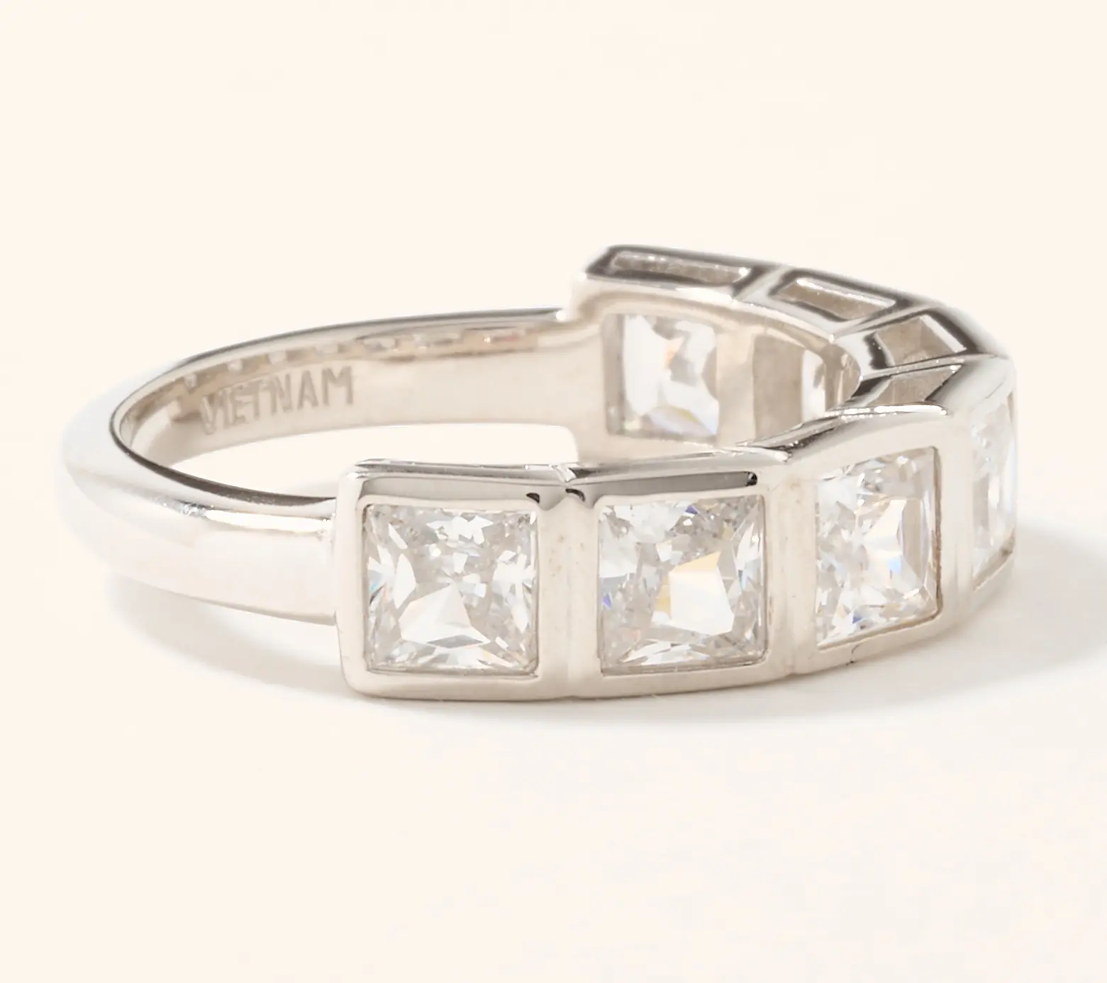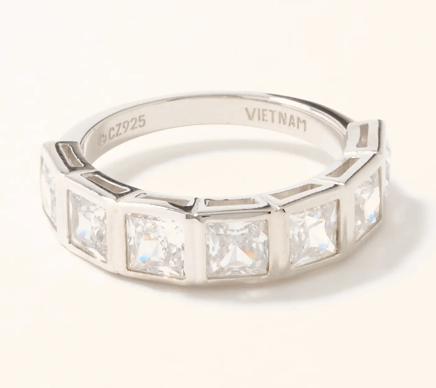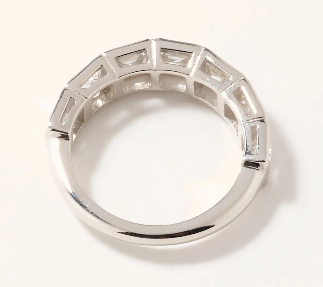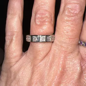 I love anything bezel set and this ring fit the bill. Very comfortable on the finger since the jewels are only on the top. It has sparkle. It has shine. It’s light weight and the “diamonds” themselves are clear, bright and a good size each.