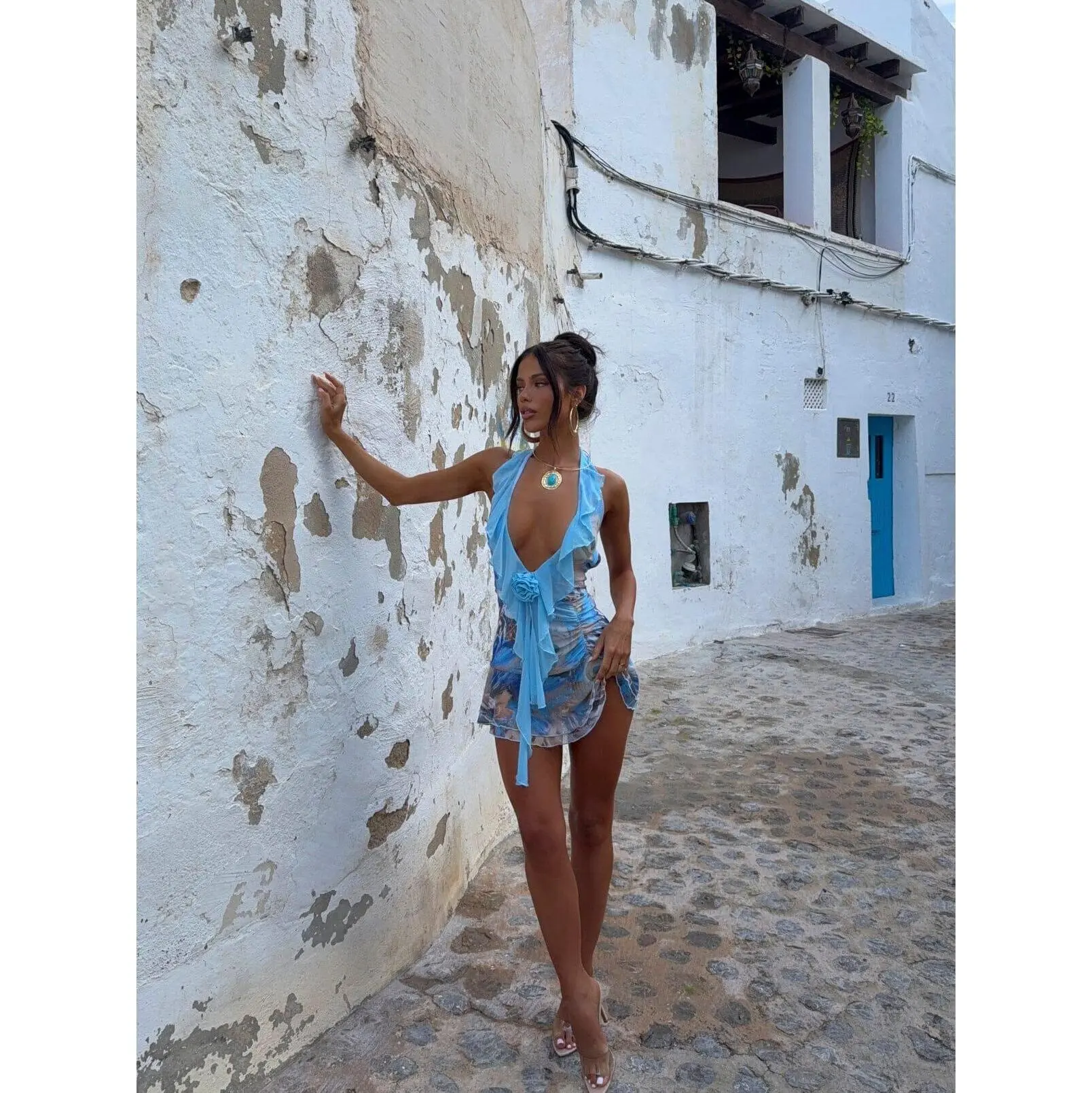 Get ready to captivate in the 'Dianna Mini Dress' in Siena, a sultry yet playful silhouette designed for your next summer escape.Crafted from printed mesh fabrication and fully lined for comfort, this mini dress features a statement plunge halter neckline adorned with cascading flounces, exuding effortless allure. A delicate mesh floral appliqué at the bodice adds a feminine touch, while the ruched hip seam and tiered flouncy skirt create movement with every step. The backless design is finished with neck and back tie closures, ensuring a flattering, adjustable fit.Style with strappy heels and dainty gold jewelry for a romantic evening look, or pair with sandals and a woven tote for the ultimate vacay vibe.