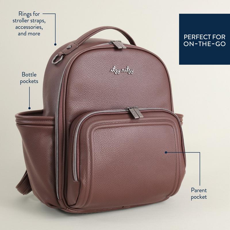 The Itzy Mini Plus™ is a small backpack diaper bag with elevated features and fresh styles. This bag includes an updated front pocket we refer to as the “parent” pocket, complete with a key lanyard and interior pockets. The trim detailing inside was designed to match the Boss Plus™, making this a great addition to our diaper bag collection. The Itzy Mini Plus is ready for any and all adventures and can be easily repurposed as an everyday bag for you or your partner! Don’t let its size fool you—this mini diaper bag backpack has ten pockets, a spacious main compartment, and even includes a matching changing pad. It also features Itzy Ritzy’s signature rubber foot that protects the base of the bag from dirty surfaces and wear and tear. The comfortable backpack straps allow you to be hands-free and ready to explore with your little one!