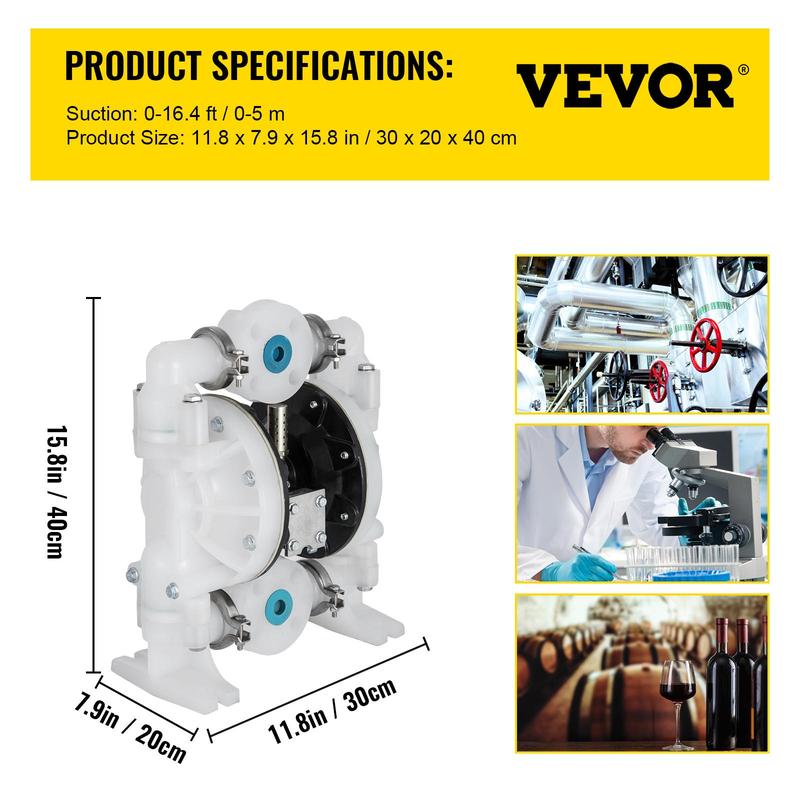 • Premium Double PTFE Diaphragms: Our air-operated double diaphragm pump adopts PTFE diaphragms, durable, corrosion-proof, and long-lasting. Max. Temperature: 150 ℉/66 ℃; Max. Pressure: 120 psi; Max. Flow Rate:79.6 GPM; Max Head Lift:275.6 ft/84 m.