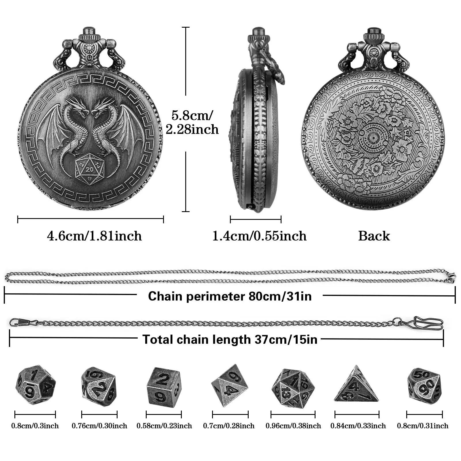 Durable Dragon Pattern Dice Set, Dnd Metal Dice, Polyhedral Dice Set, 1 Set Dice with Chain & Watch Case, Role Playing Game Accessories, Tabletop Games for Party, Family, Friends
