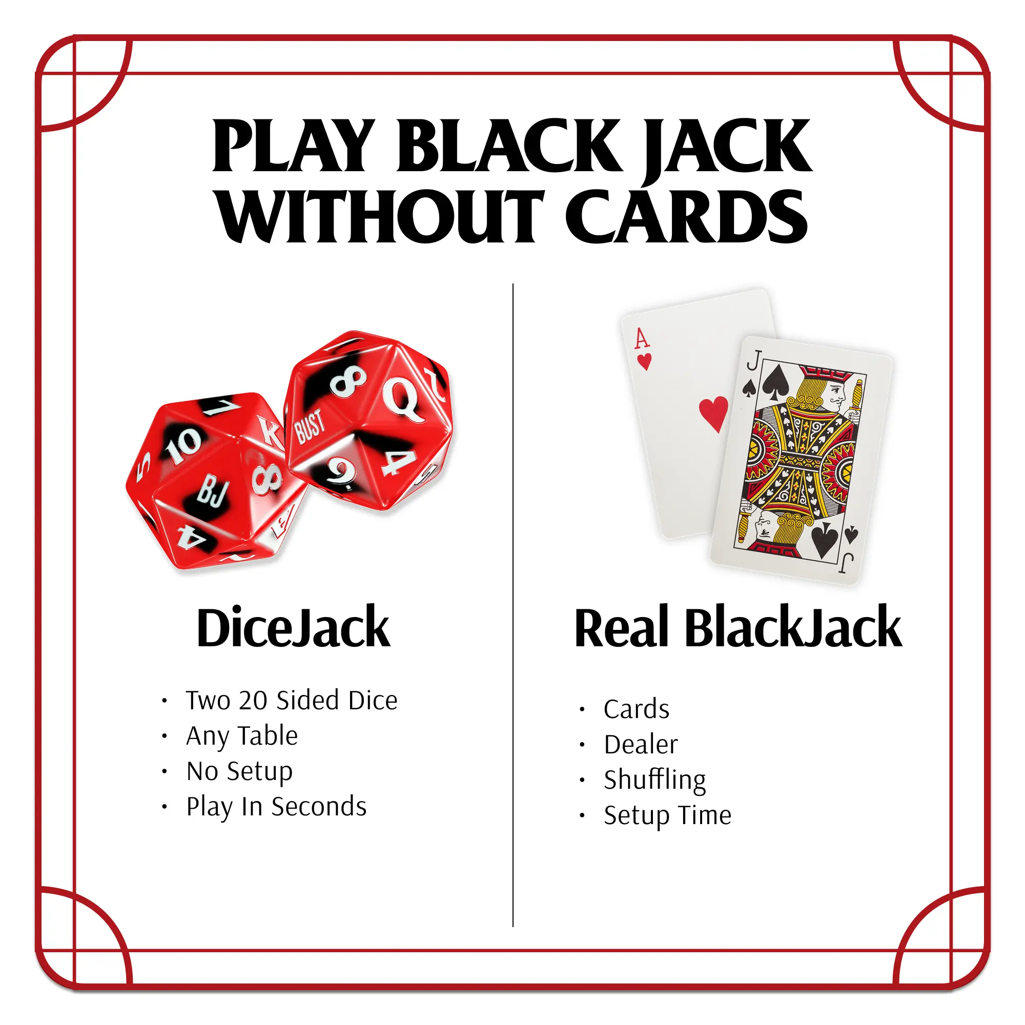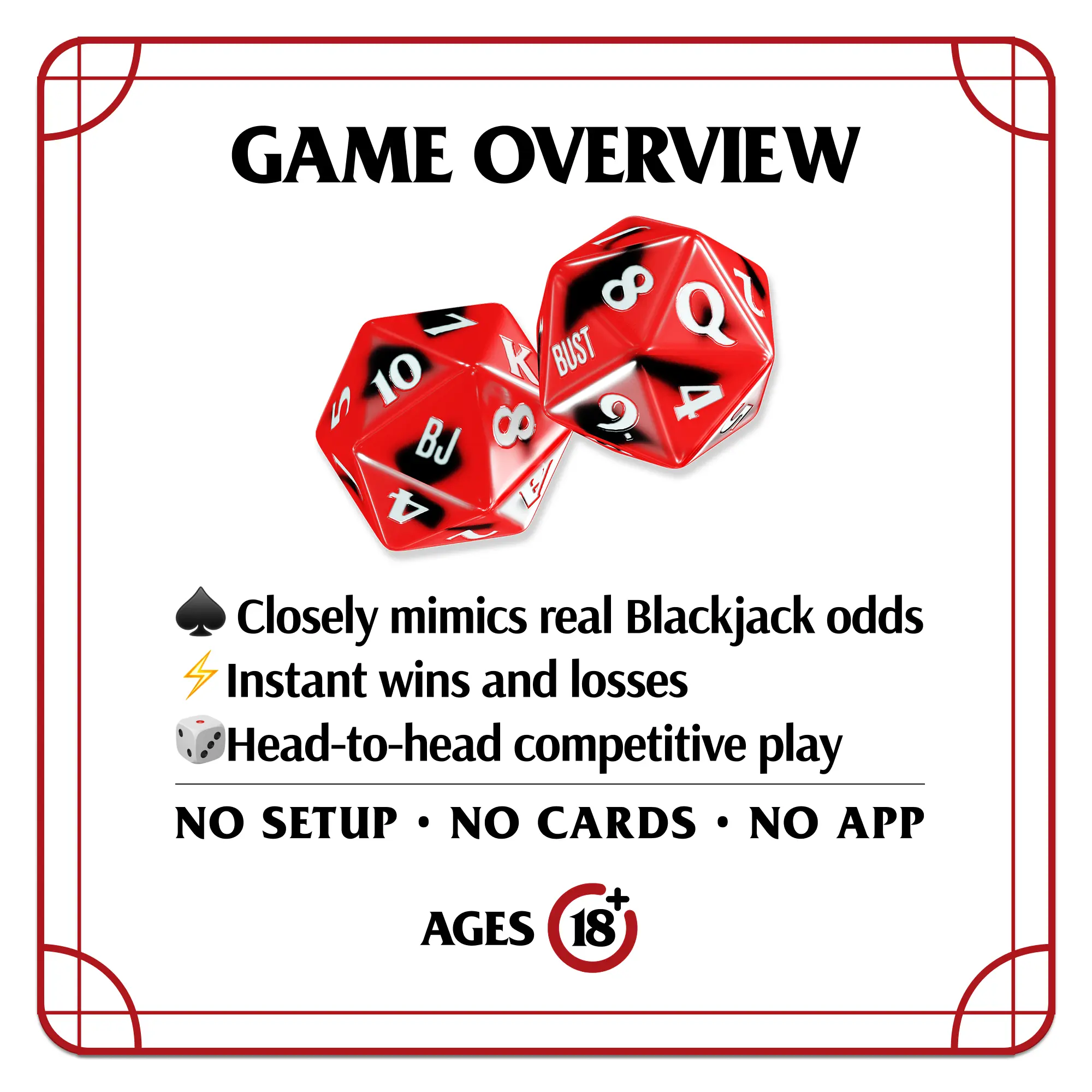 Each set includes two custom 20-sided dice. The dice feature values 2β10, face cards J, Q, K, and A, along with dedicated Blackjack (BJ) and Bust faces to replicate real blackjack rules.