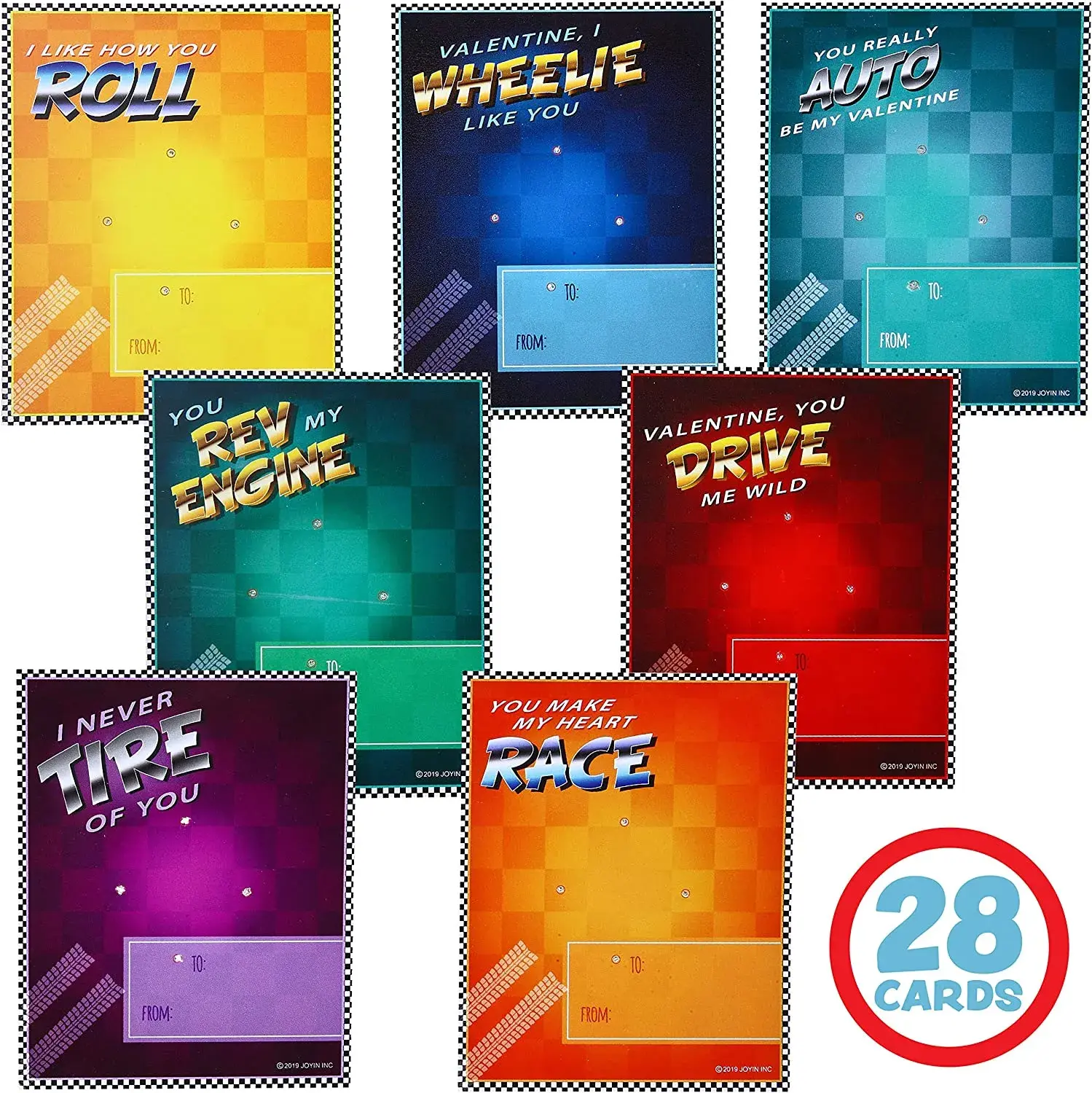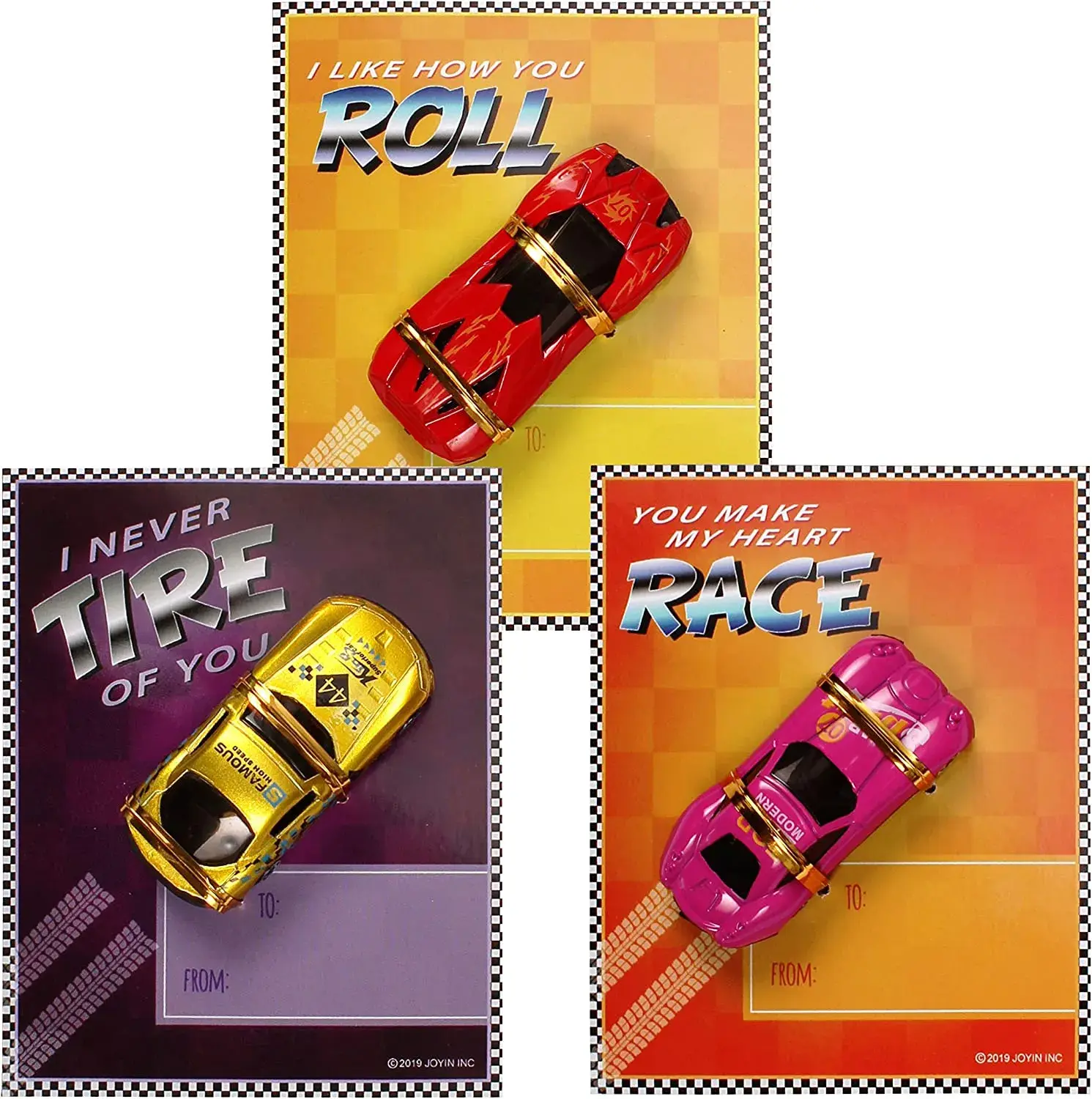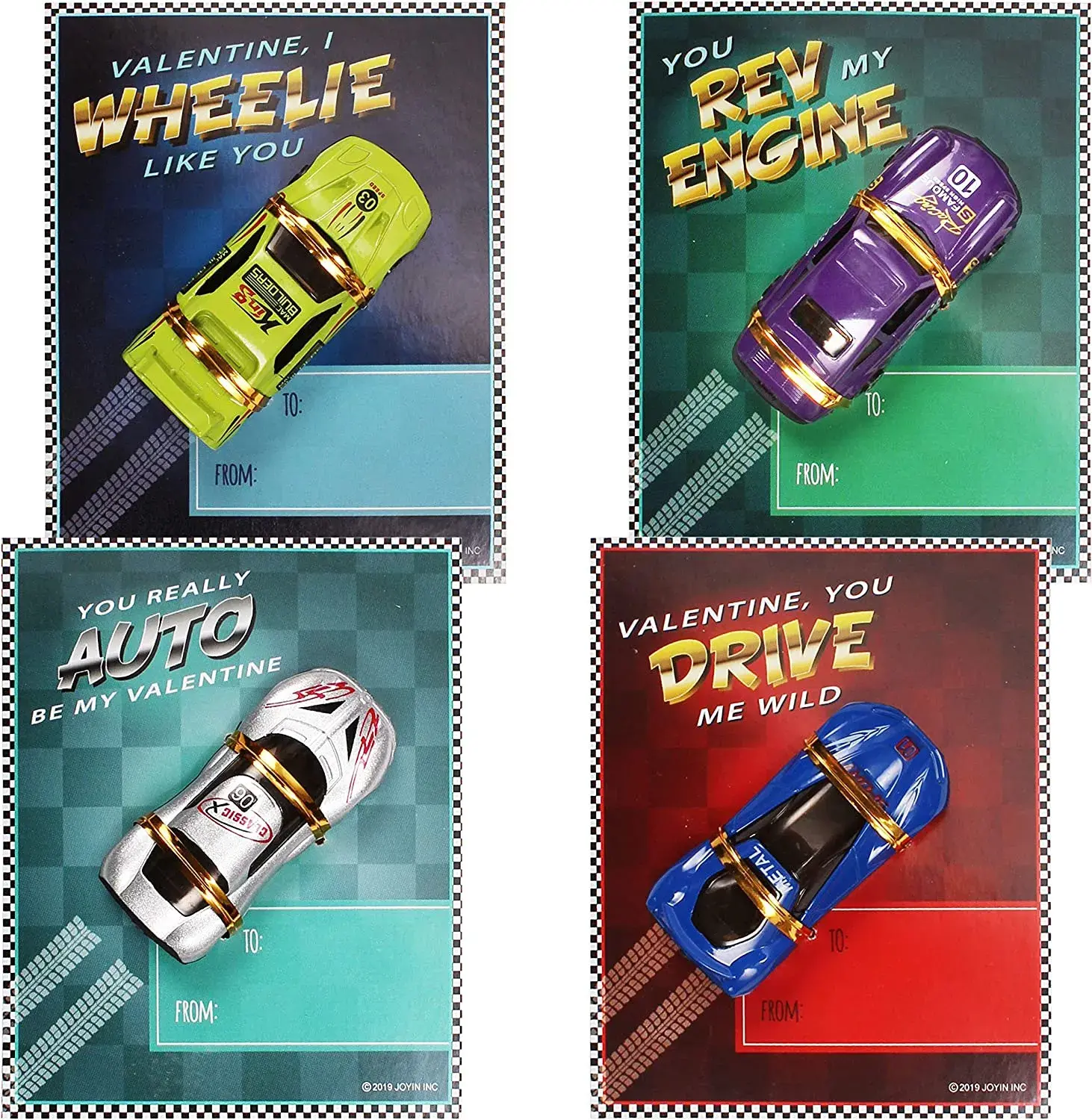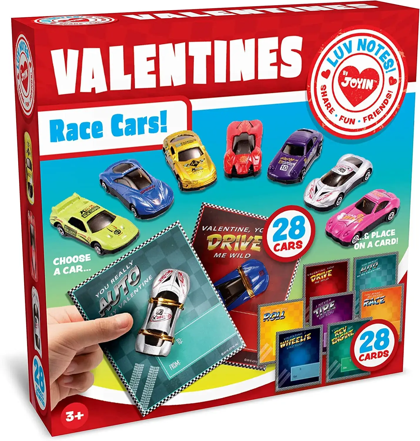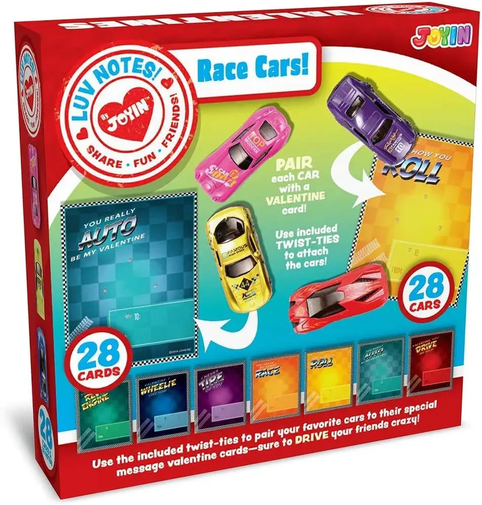 Valuable Pack. This package contains a total of 28 Valentine's Cards featuring 7 different types of die-cast racing cars.