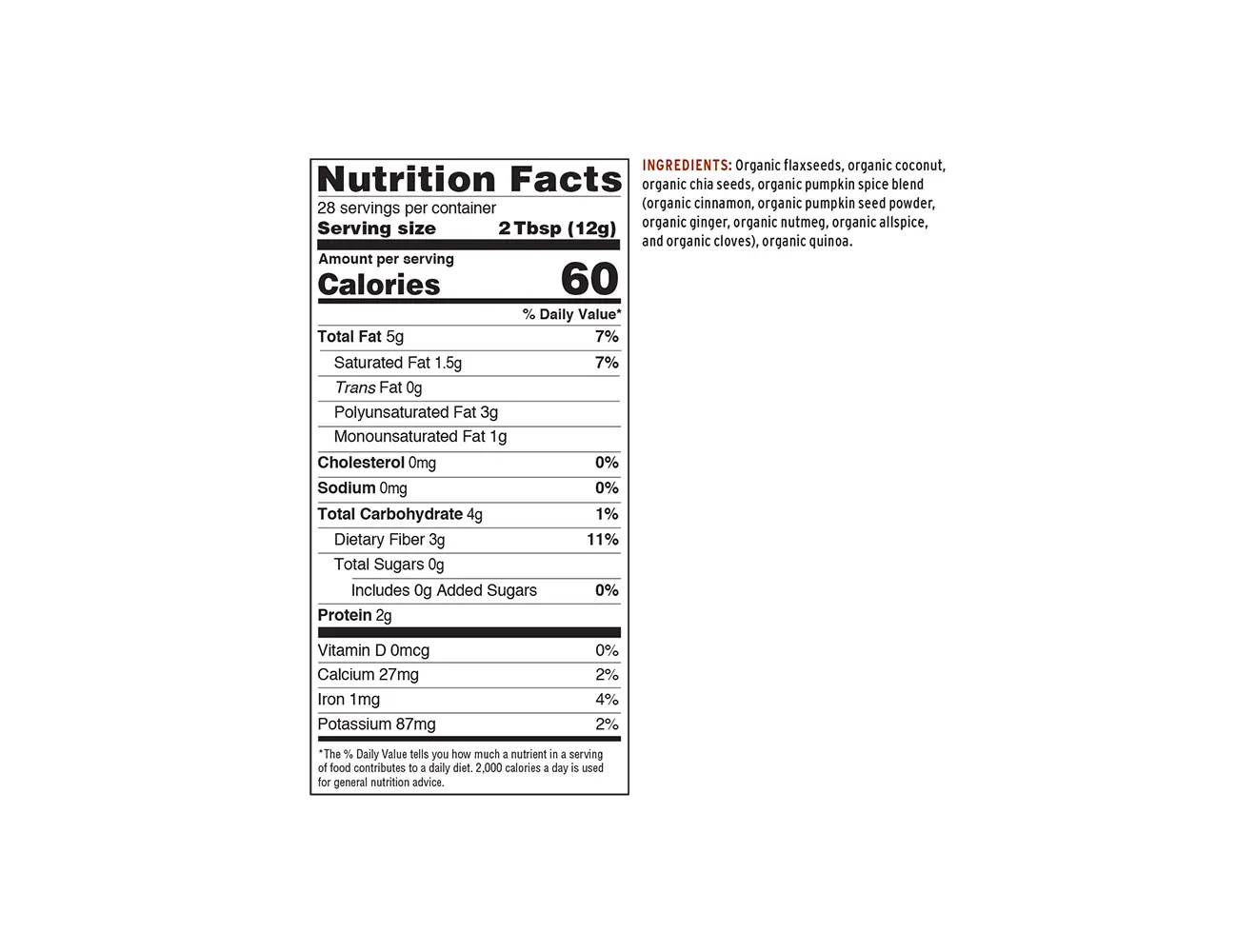 A Nutrition Powerhouse with Omega-3 fatty acid (ALA), dietary fiber, antioxidants, minerals, amino acids and plant-based protein. With a delicious, natural pumpkin spice flavor, this all-organic blend is an easy way to support your digestive health* and fuel your body with the benefits of nutrient-dense whole superfoods.