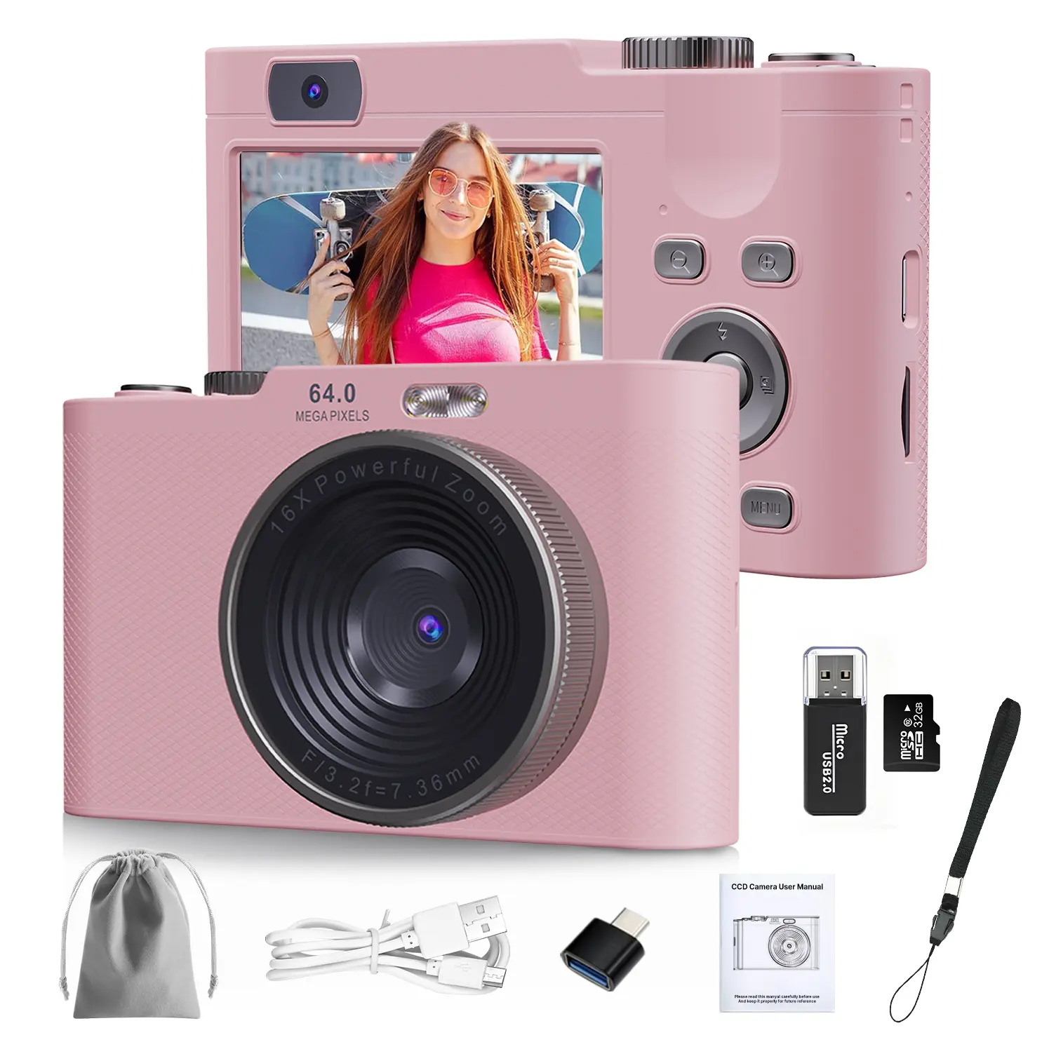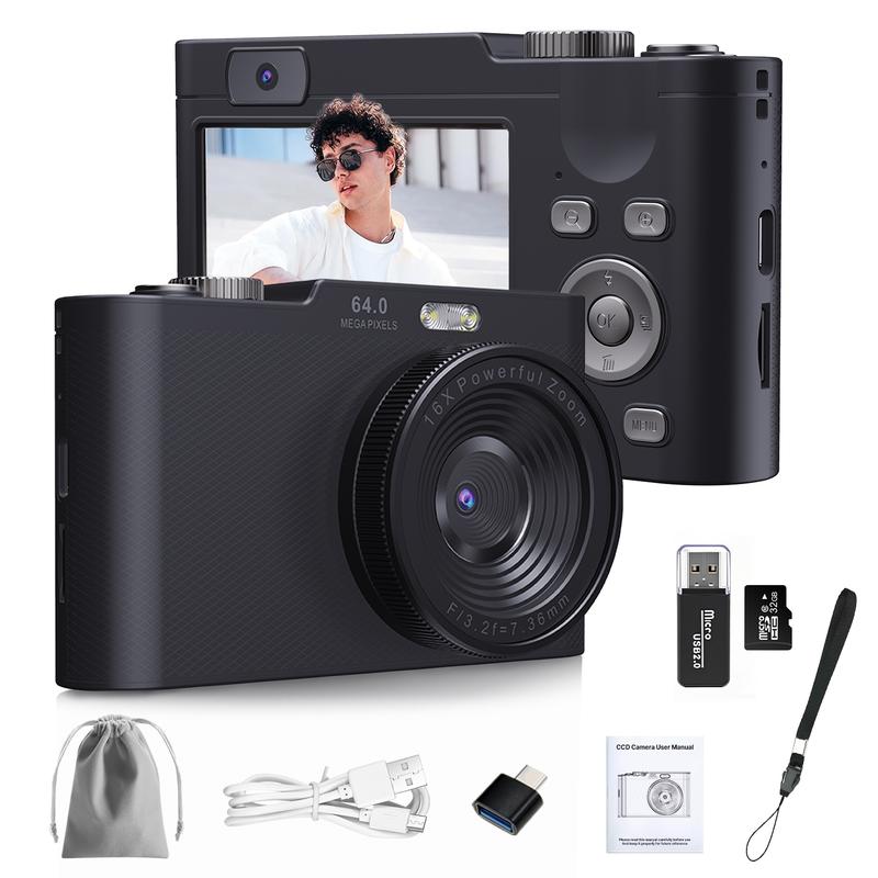 The package includes a 32GB SD card/Card Reader/Pouch/Data Cable/Belt/Adapter, ready to use straight out of the box. No extra memory is needed. It's vlog-ready with a compact design, fitting in any pocket. The flip screen makes self-recording easy.