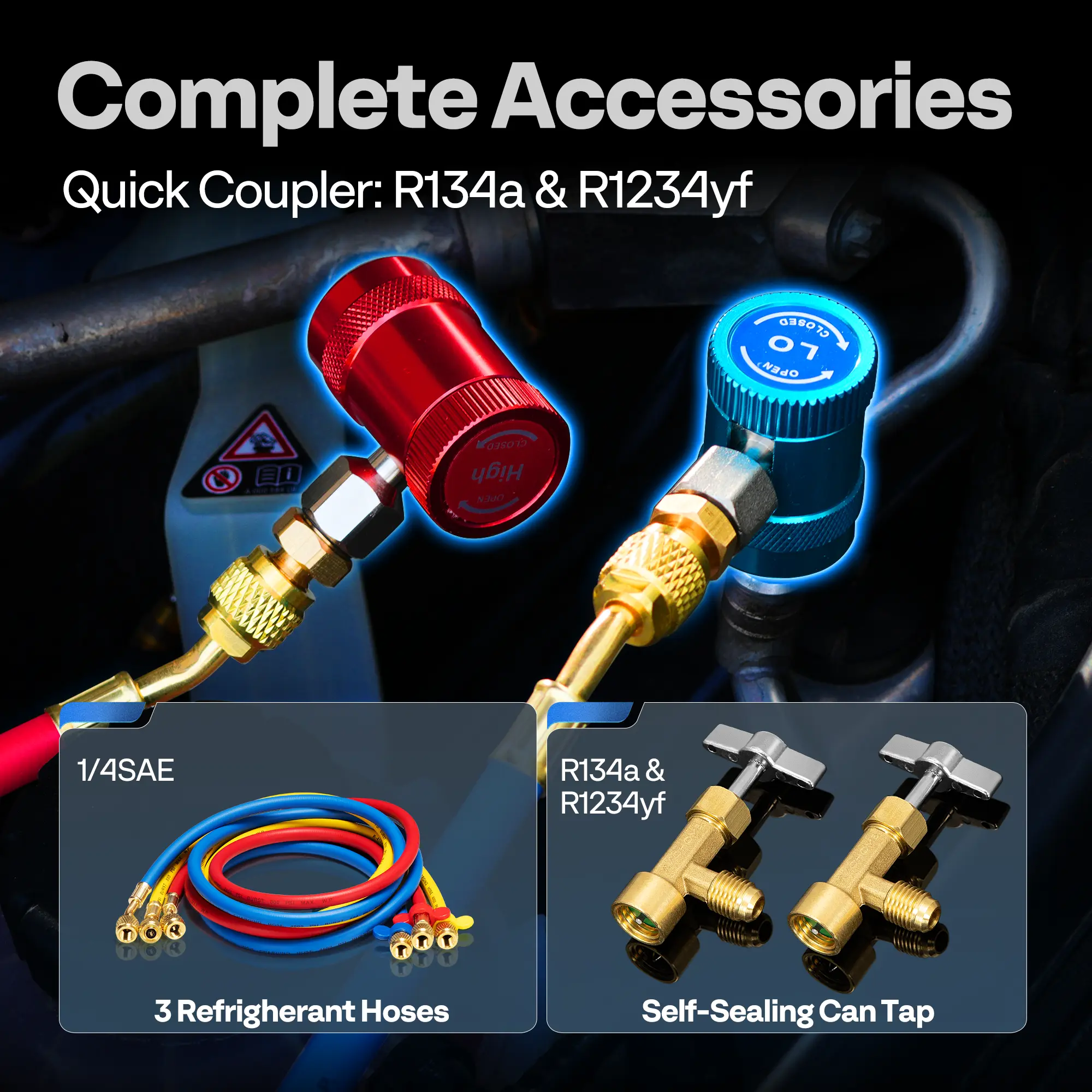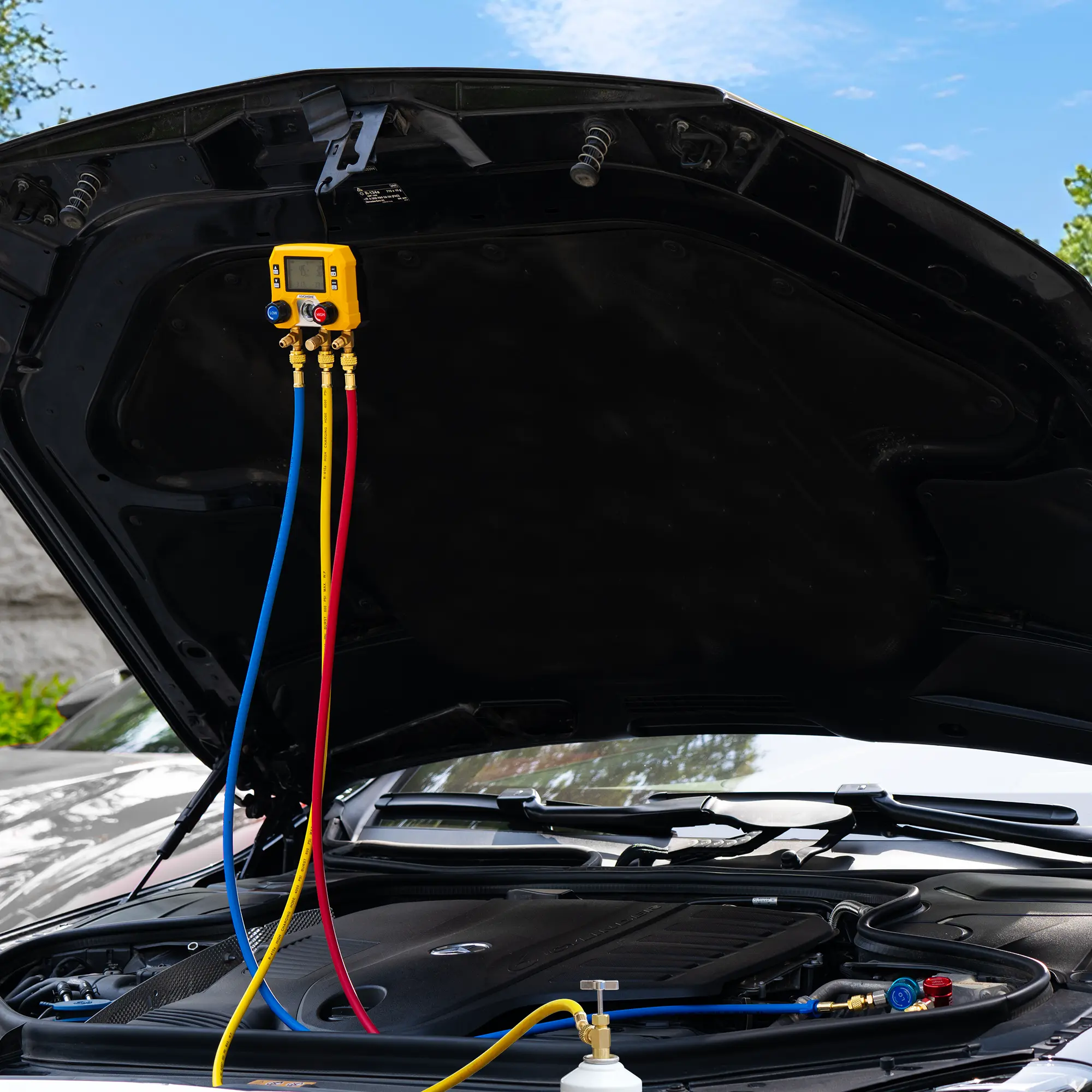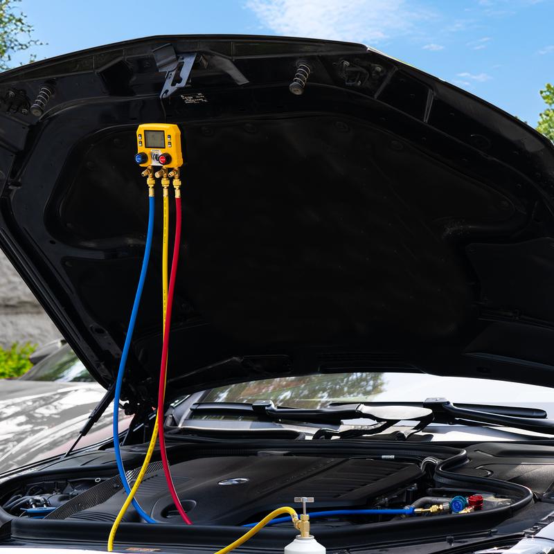 ·Complete Accessories: Comes with a heavy-duty hose set (three hoses with shut-off valves) for fast and efficient system analysis and optimization; Includes R-134a and R-1234yf quick couplers, as well as R-134a and R-1234yf self-sealing can taps for broad vehicle compatibility; A hook allows you to hang the gauge for hands-free operation, and the included carrying bag with shoulder strap makes transport easy; Note: This device requires three AAA batteries which are not included in the package