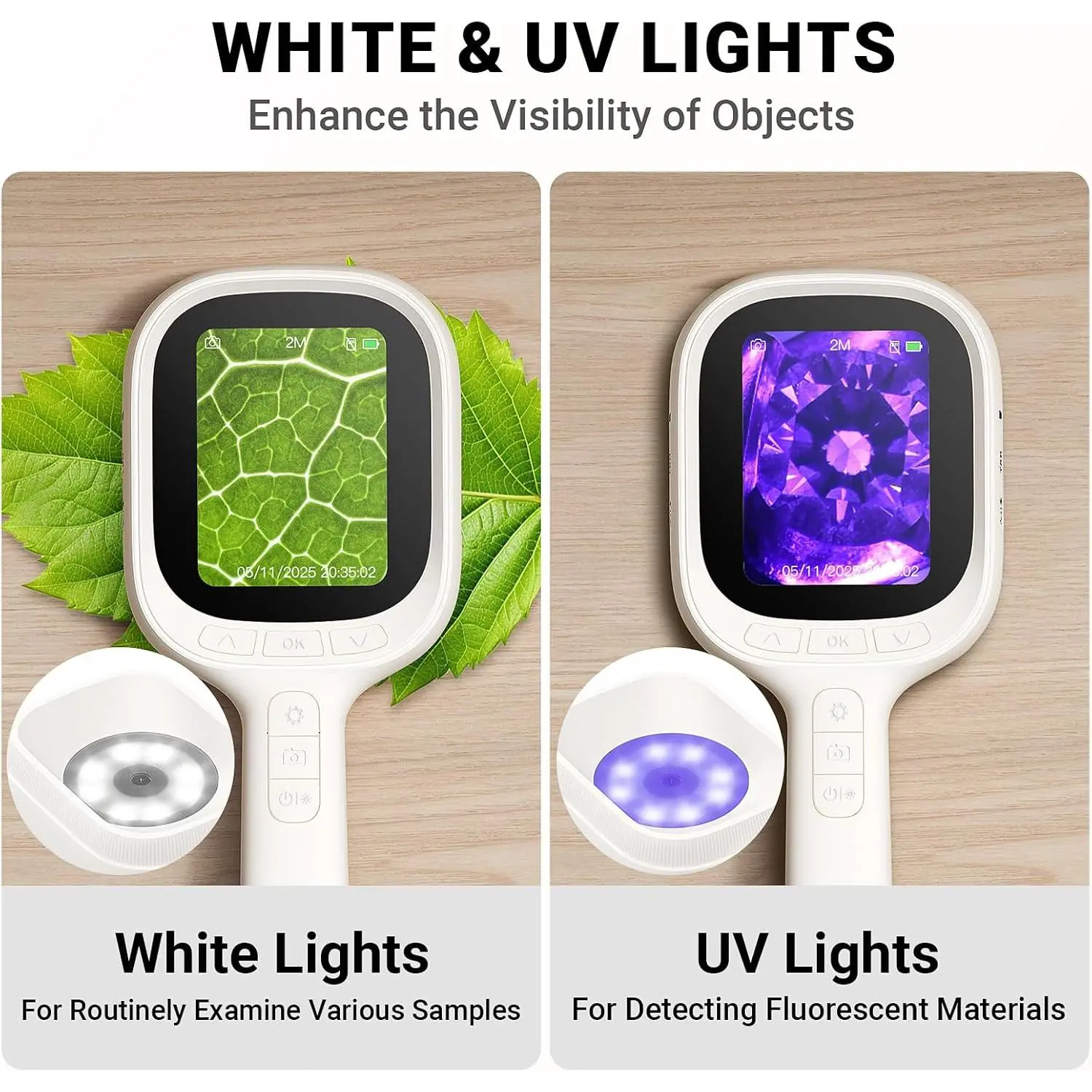 Dual LEDs for Illuminated Results: The 8 White + 8 Ultraviolet LED system offers versatile illumination. While the White light focuses surface details (e.g., circuits, slides, , etc), the UV light reveals flaws (e.g., -cracks, residues, etc.). effortlessly between both modes to precisely meet professional needs across electronics, , biology, and .