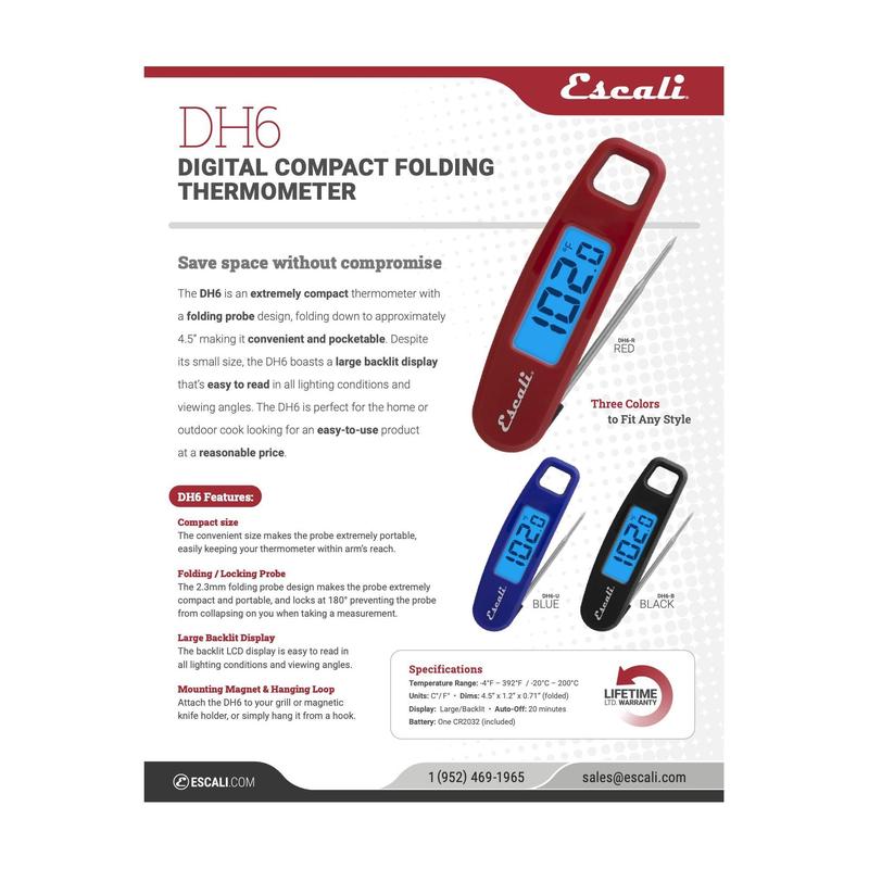 The DH6 digital thermometer is a great tool for the home cook or master griller looking for an easy-to-use temperature gauge. It's extremely portable and boasts a large backlit LCD display that is easy to read in all lighting conditions and viewing angles. From Escali.