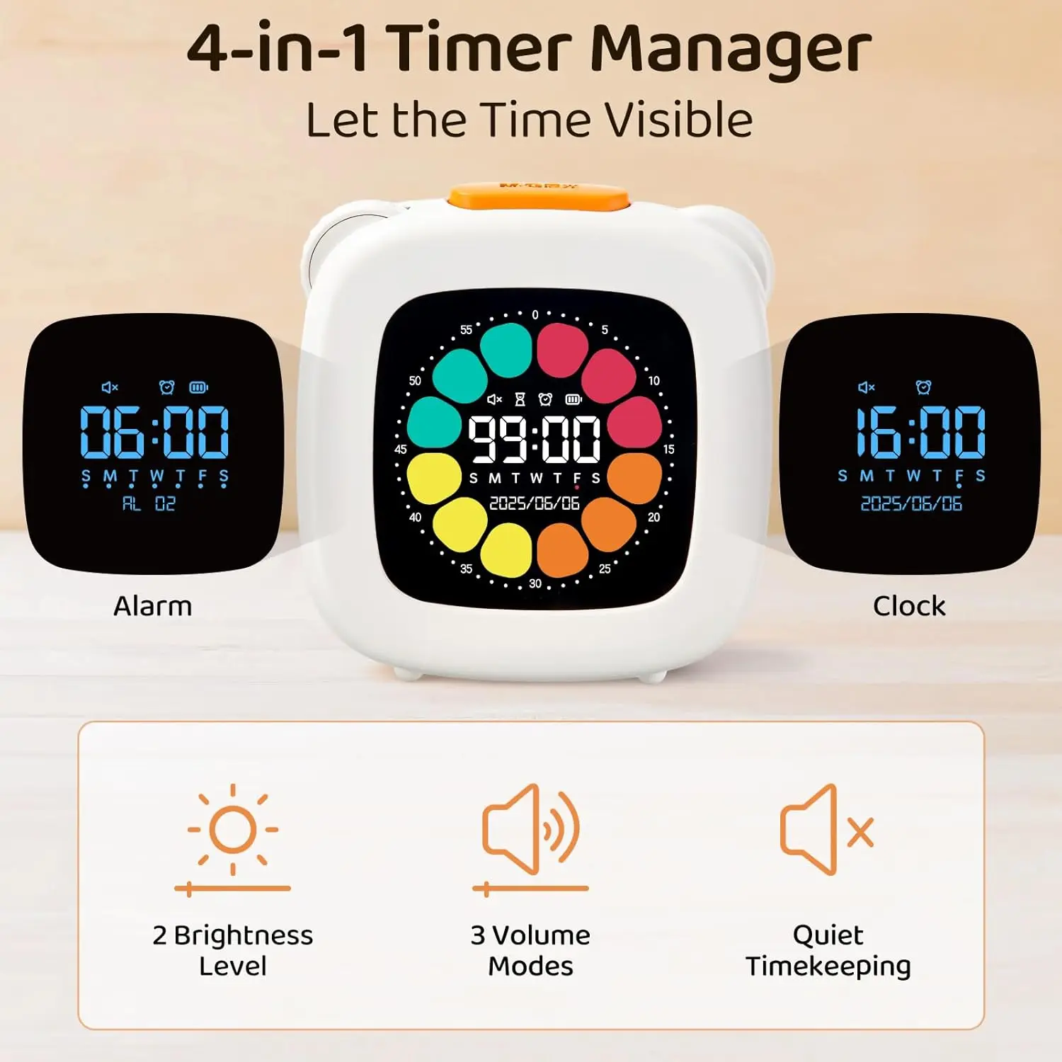 User-Friendly with 3 Sound Modes: Choose from silent, medium, or loud alert levels to suit any —from quiet libraries to busy kitchens. The large, colorful snooze button top makes silencing the a satisfying -tap experience.