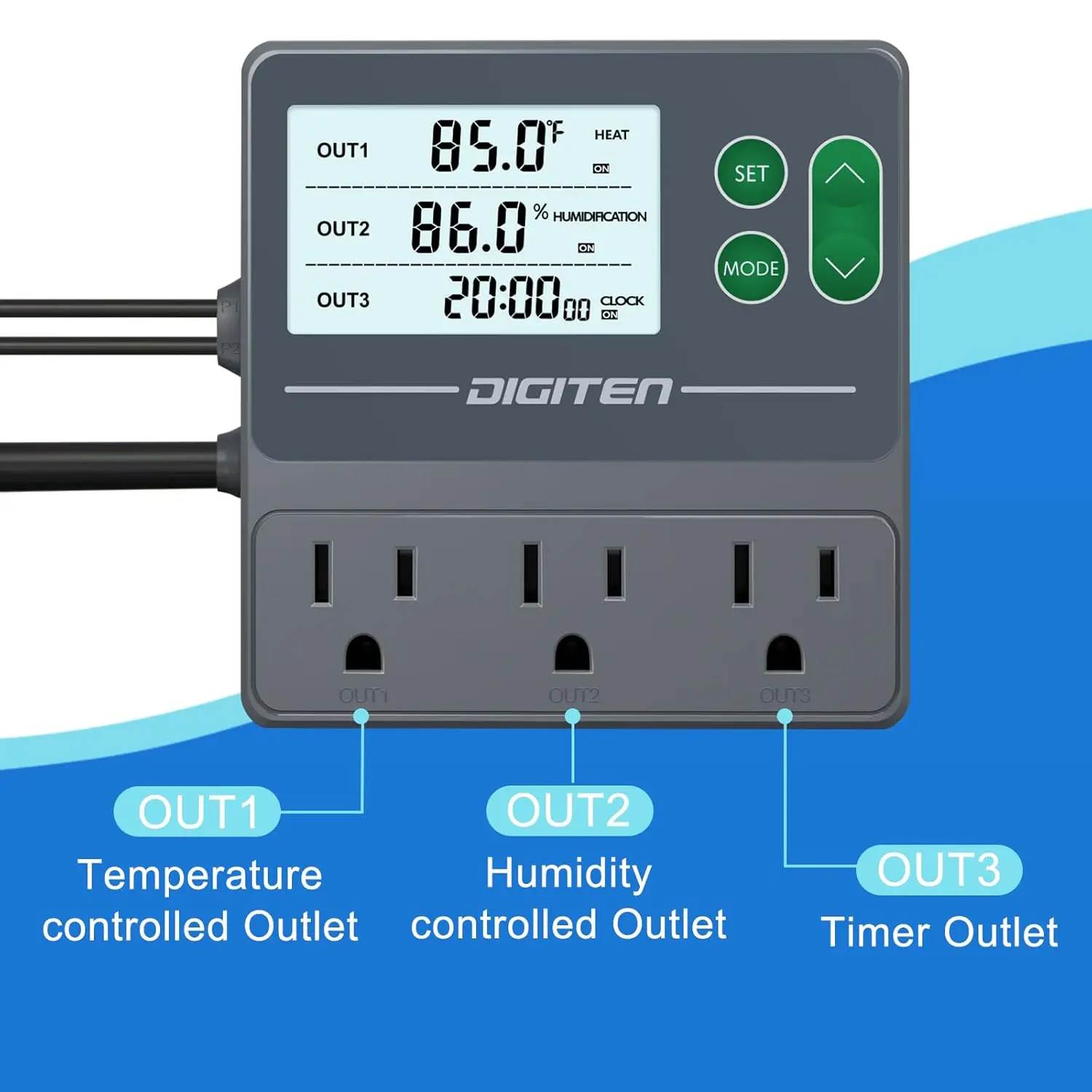 DIGITEN Temperature and Humidity Controller with Timer - 3 Outlet, 2 Separate Probes, Plug in Temperature Controller for Reptiles,Snake, Mushrooms, Tent, Triple Control for Temp,Humidity,Time