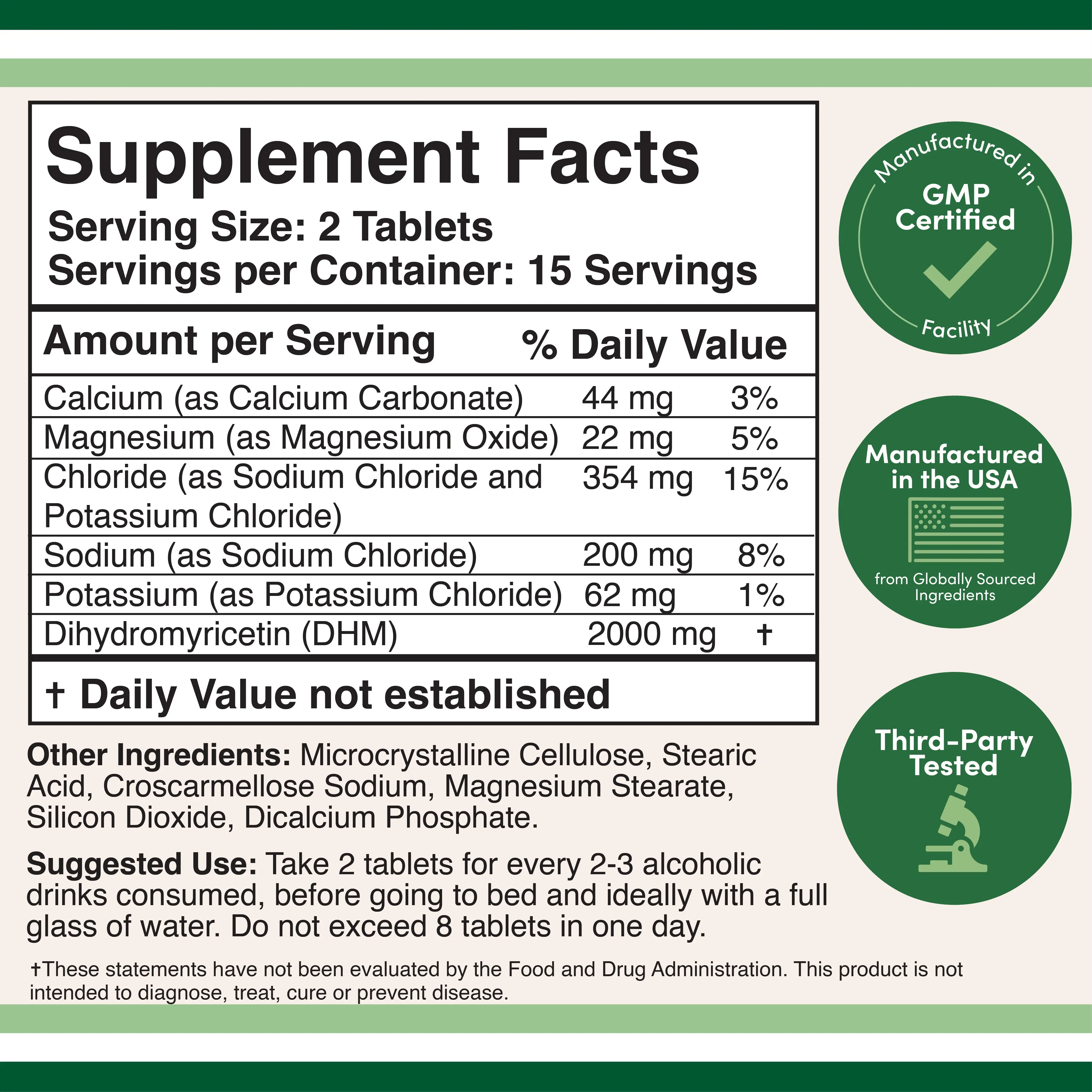 Amount per Serving: 1000 mg Dihydromyricetin (DHM) Supply: 30 Day Supply Delivery Form: Tablet