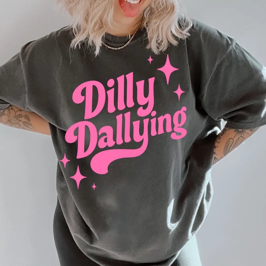 This Dilly Dallying tshirt is my idea of dopamine dressing at its finest!! Plus the print is on a Comfort Colors tee! @Cutting Creative Apparel #dillydally #graphictees #dillydallying #cuttingcreativeapparel #ttsacl