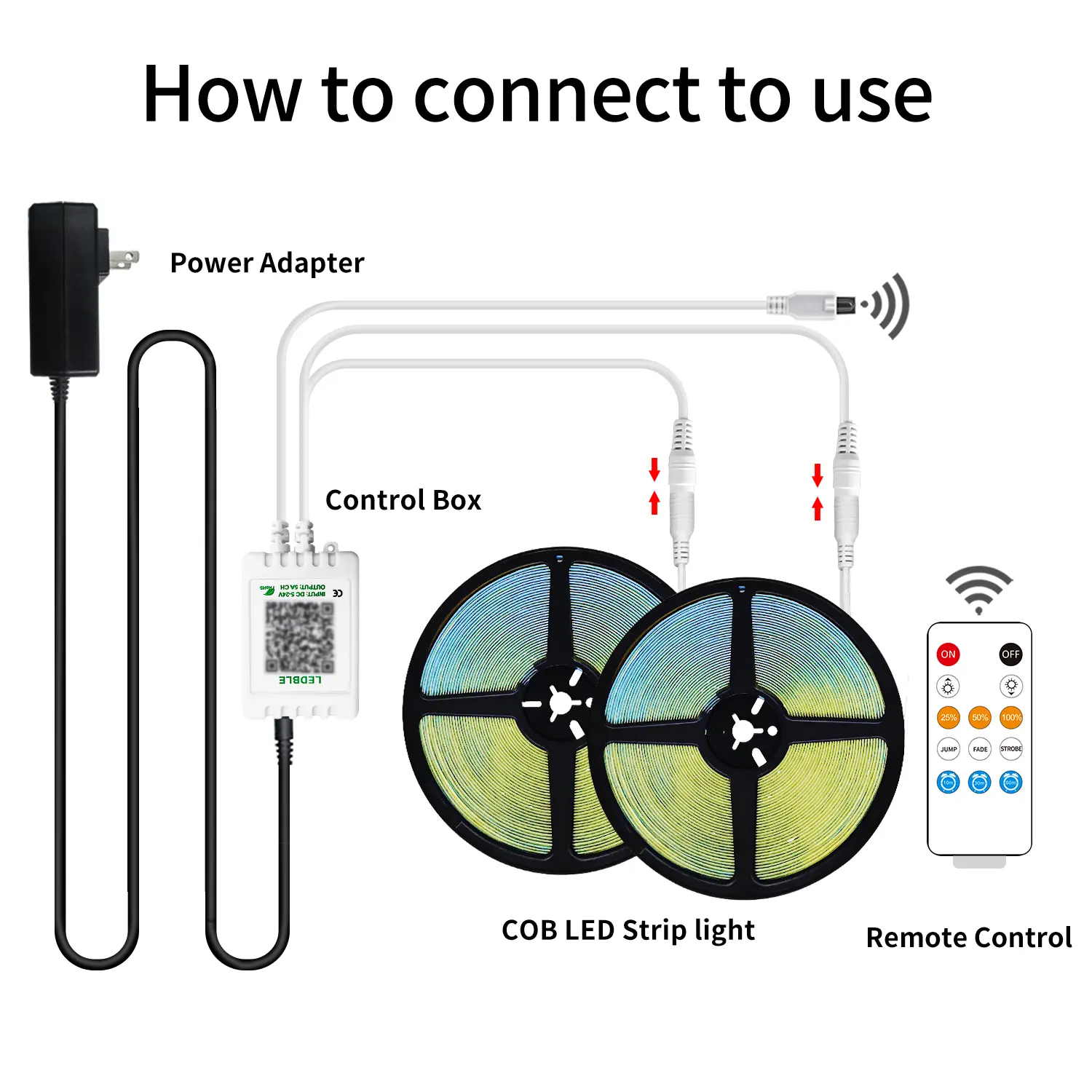 ·COB led strip light set includes: 1),COB LED strip white 2, 1.power supply,1 controller, 1 remote control,Notes: 1.power supply controller is not waterproof; 2.before using the remote control, the insulation at the end must be removed 3,cob led strip it should be installed on a clean/dry/smooth surface.If you still have a problem, please contact us, we will solve it within 24 hours.