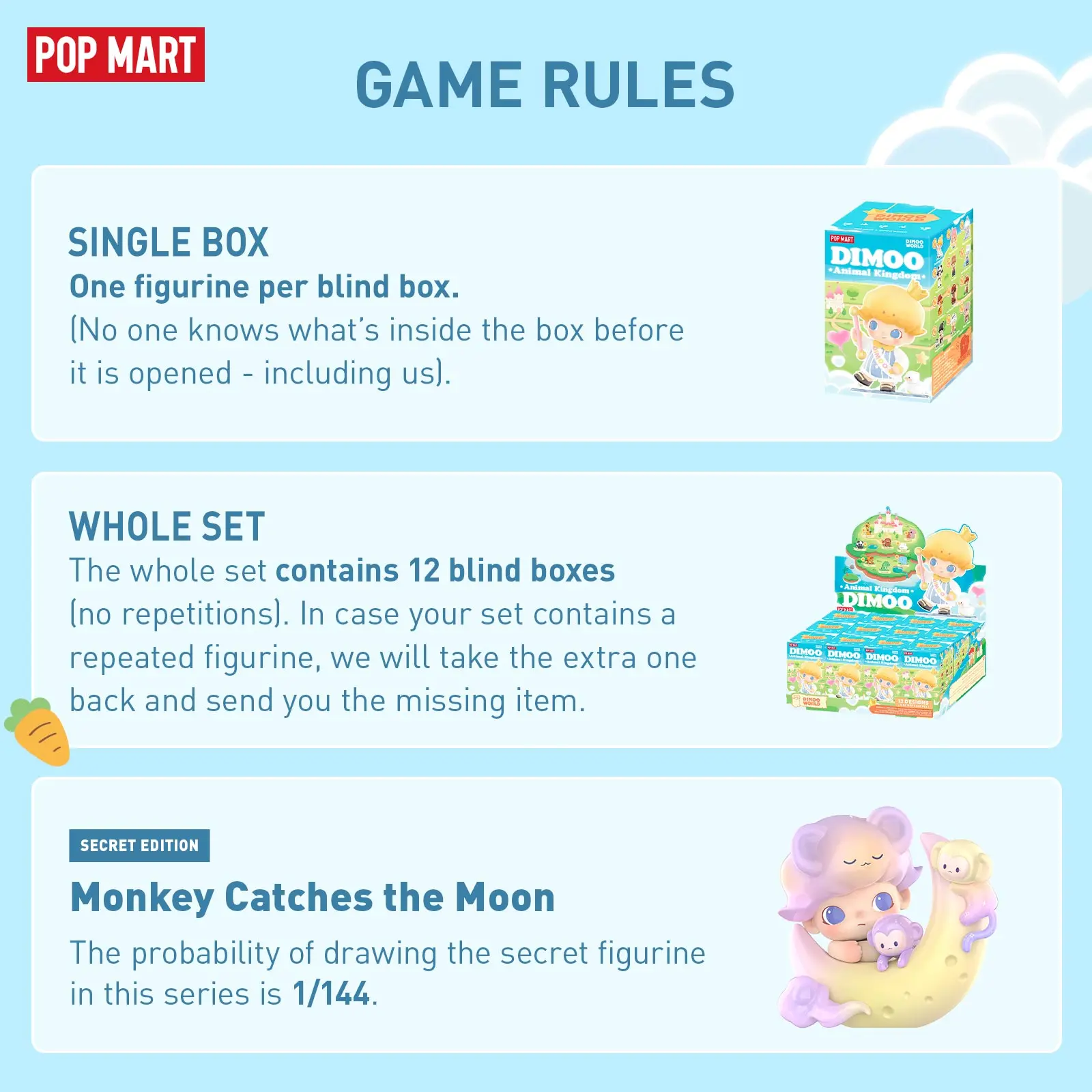 “Blind box” means no one knows which exact figurine of the series you may get before opening—nor do us. A regular figurine will be replaced if the secret edition appears in the whole set (big congratulations!!!)