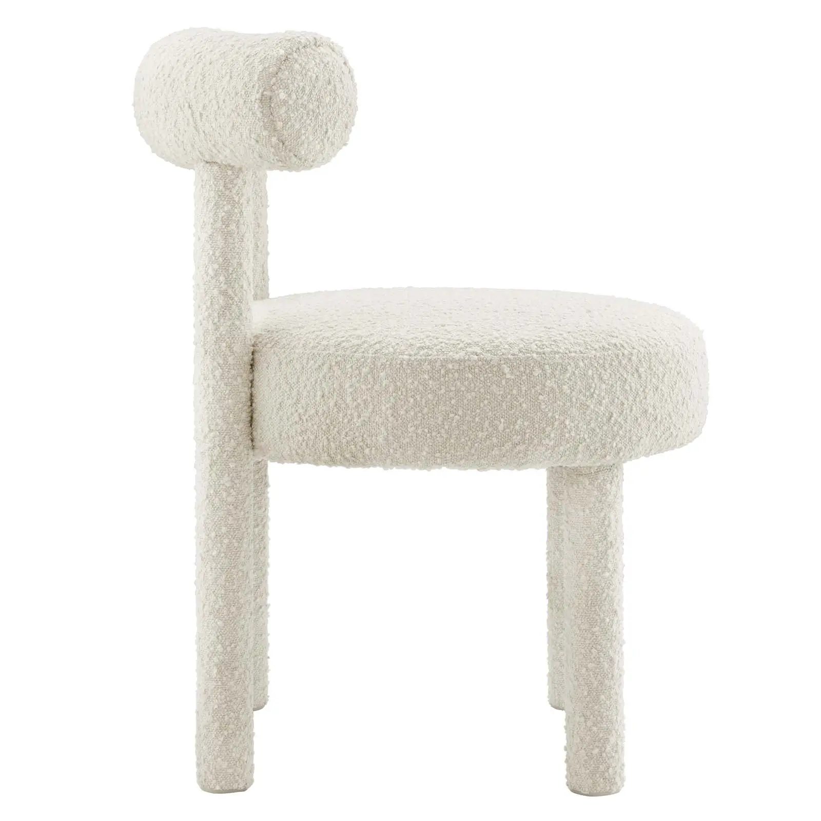 Enhance your space with the exquisite Toulouse Boucle Upholstered Dining Chair. This unique piece combines dining chair functionality with accent chair elegance. Upholstered in beautifully textured boucle fabric, this dining chair exudes modern luxury and glam deco style. The curved bolster pillow backrest, circular seat, and dense foam padding provide unparalleled comfort and unmatched aesthetics. With non-marking foot pads to protect your flooring, this boucle dining chair adds a touch of sophistication to any room. Weight Limit: 330 lbs.