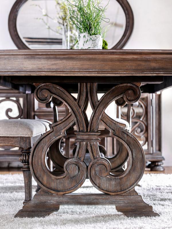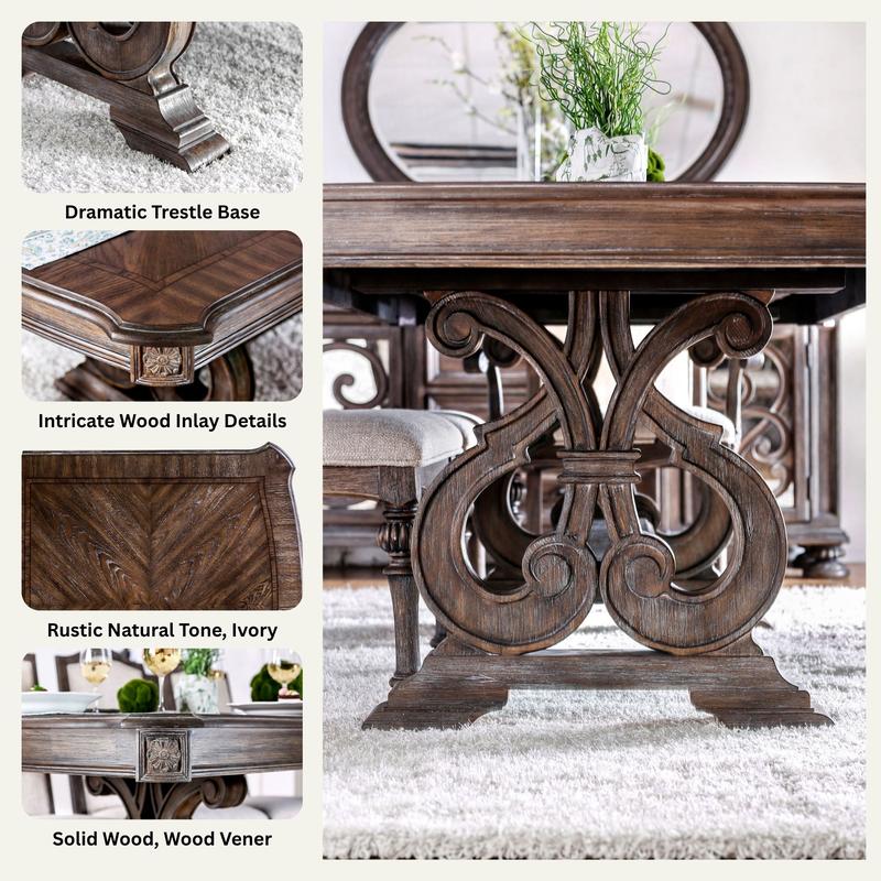 Make a grand impression with the Arcadia Dining Collection, where rustic charm meets timeless sophistication. Featuring an exquisite wood inlay tabletop and a dramatic trestle base, this set exudes classic beauty and craftsmanship. The rich rustic natural tone finish is perfectly complemented by the ivory fabric upholstered chairs, creating a cozy yet elevated dining experience.