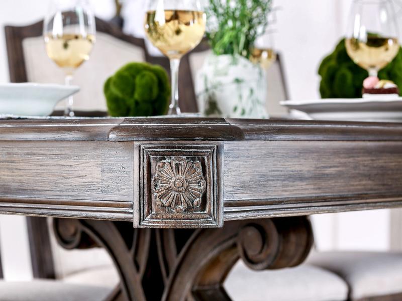 The intricate leg carvings and delicately cut chair backs add a layer of artistry that brings elegance to every meal. Plus, the table’s 18" expandable leaf easily accommodates guests, making it perfect for gatherings big or small.