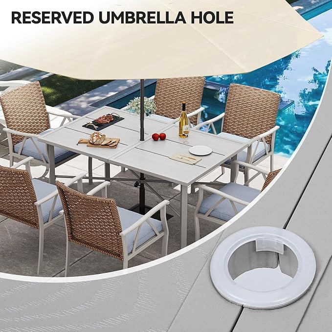 Modern Design: Our 6-person table features clean lines with a contemporary design; The pre-drilled 2'' diameter umbrella hole accommodates most patio umbrellas, making it ideal for family dinners and social gatherings