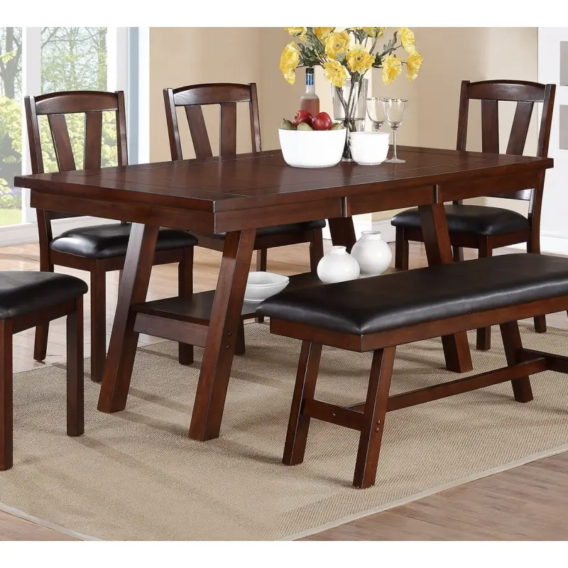 A strong design of bold lines and dark hues, this formal dining table set features chairs(Sold separately) and tables of various heights and a bench covered in a dark walnut finish in solid wood birch veneer.The chair back supports have a "v" design making it a handsome piece for your home dining space.