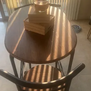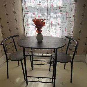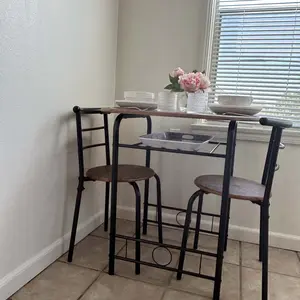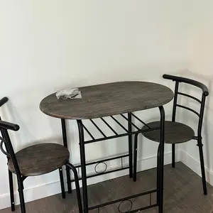 Create a cozy dining area with this practical dining table set. This set is made of premium MDF boards and a metal tube structure, sturdy enough for years of use. Daily maintenance will be easy with a waterproof tabletop and powder-coated steel legs. Given 2 chairs, you can enjoy coffee or breakfast alone, with your partner or friend comfortably. When the chairs are pushed in, this compact dining set takes up very little room, which is ideal for small spaces. This set showcases curved lines and round edges and gives you a relaxed and inviting feeling. The timeless color scheme and small dimensions make this set ideal for kitchens, balconies, bedrooms, apartments, dorm rooms, offices, cafés, temporary activities, etc.