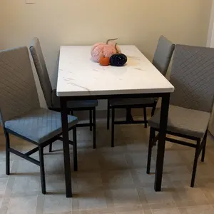 Really enjoy this dining set, pretty simple to put together, did it myself, took 1.5hrs give or take, perfect for a small apartment, no scent to it, chairs are sturdy but not to be taken advantage of, the padding is a type styrofoam for the back support of the chair, seat is fairly comfortable.