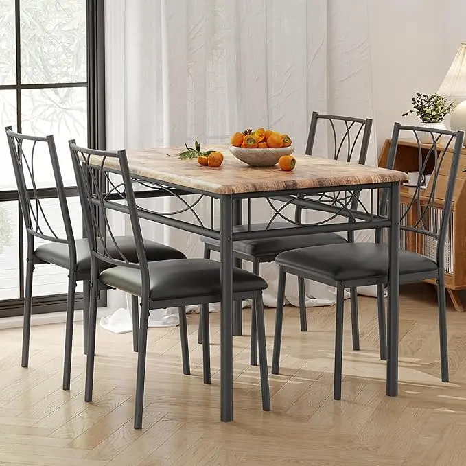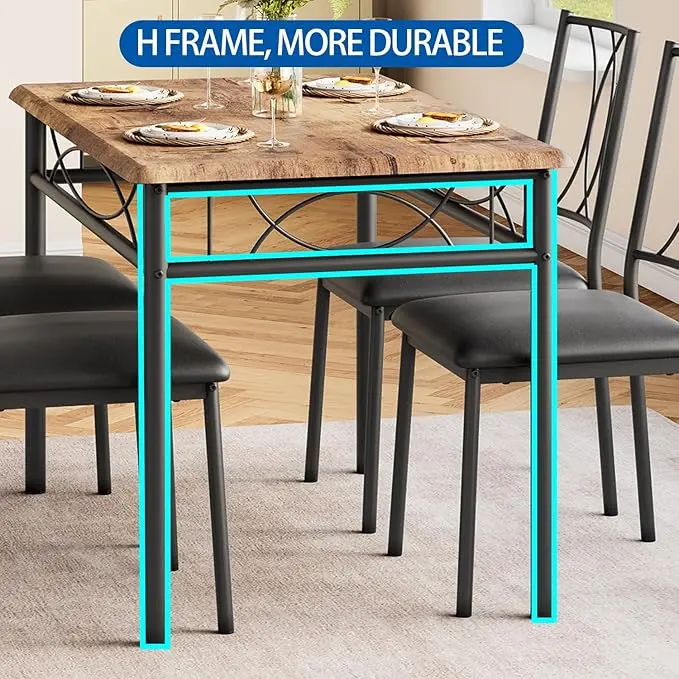 ·1. Built to Last: Crafted with a reinforced metal frame and brackets, this 5-piece dining table set for 4 delivers increased stability. The thickened MDF tabletop withstands daily use while dual X-braced chairs offer an exceptional 450 lbs weight capacity. Enjoy peace of mind with durability that grows with your family