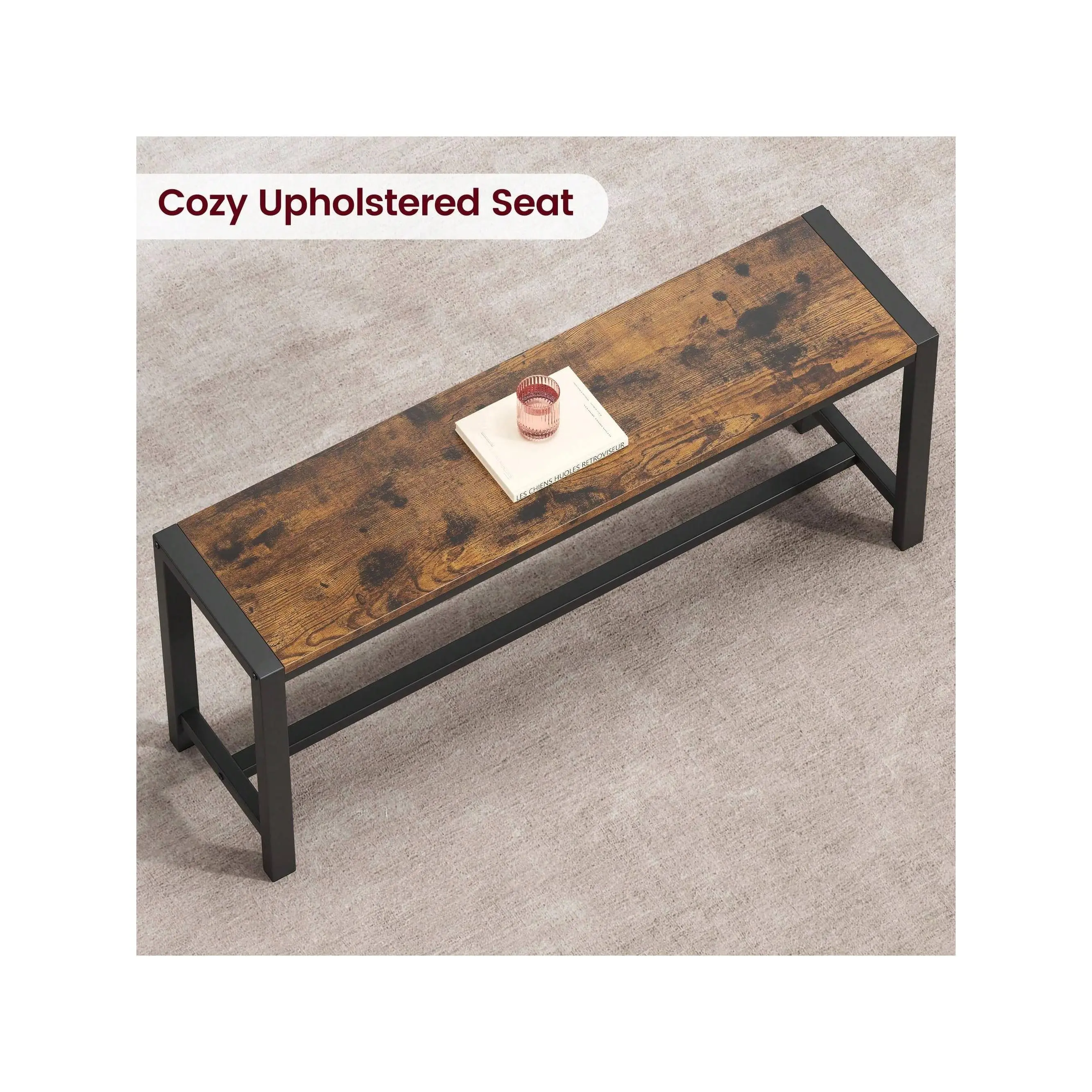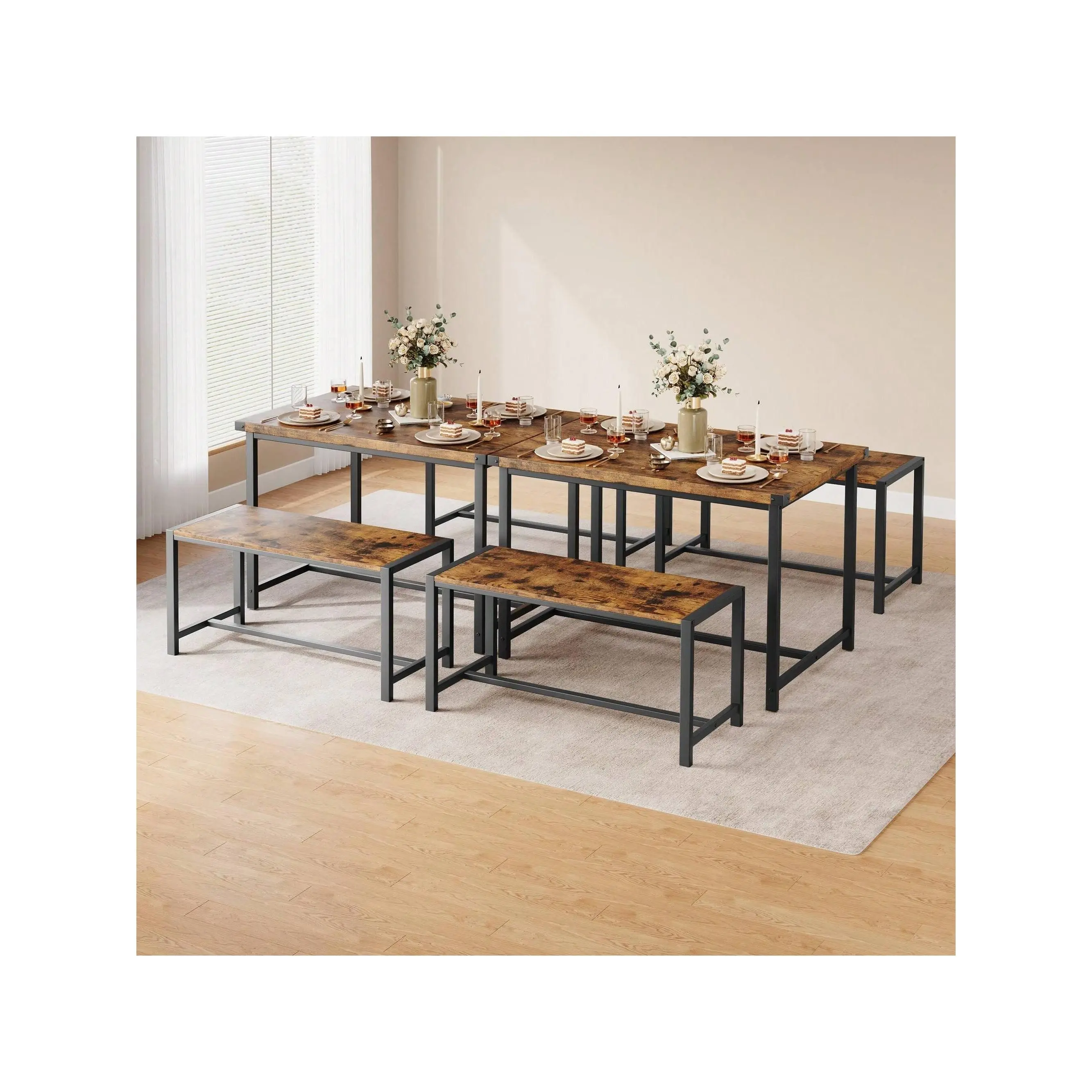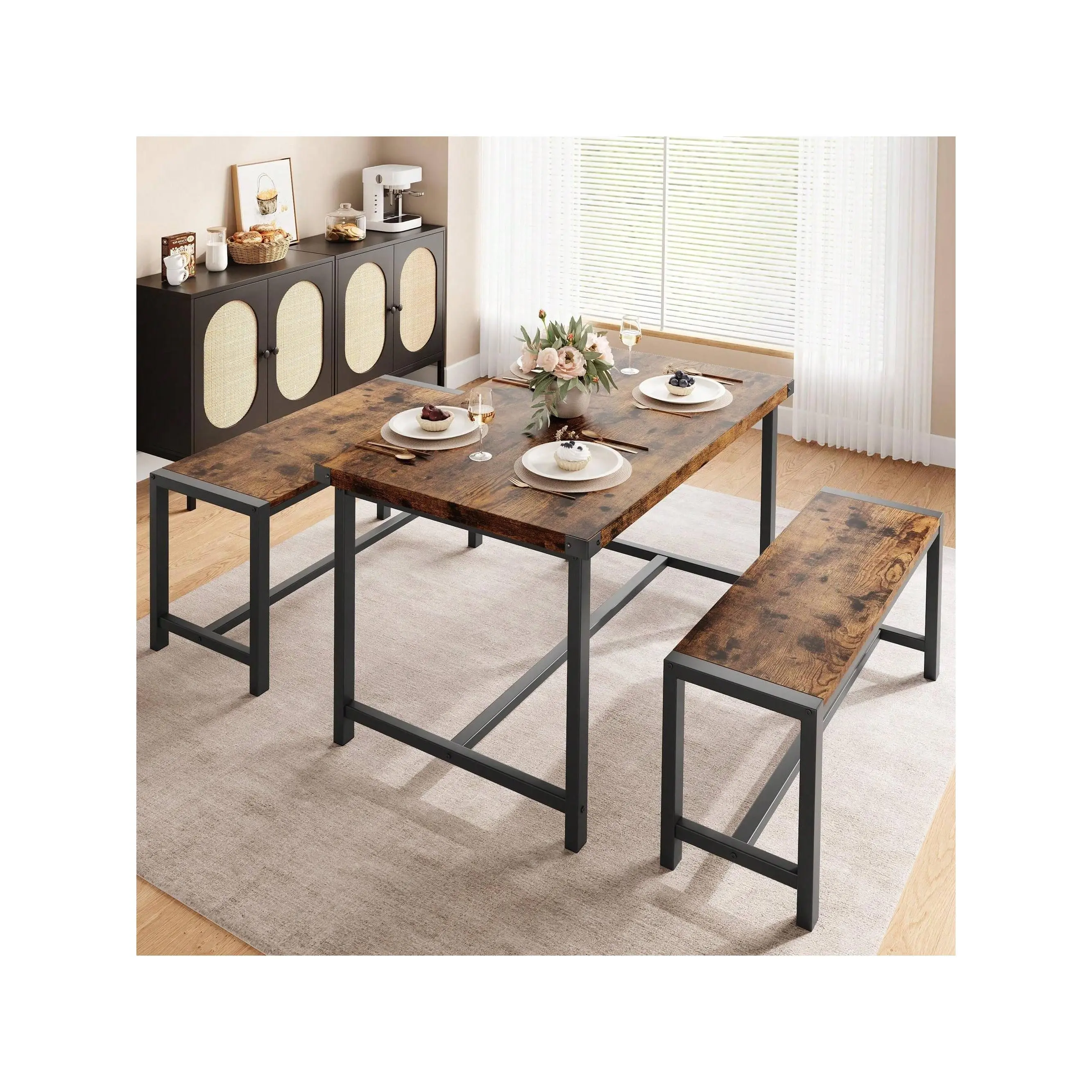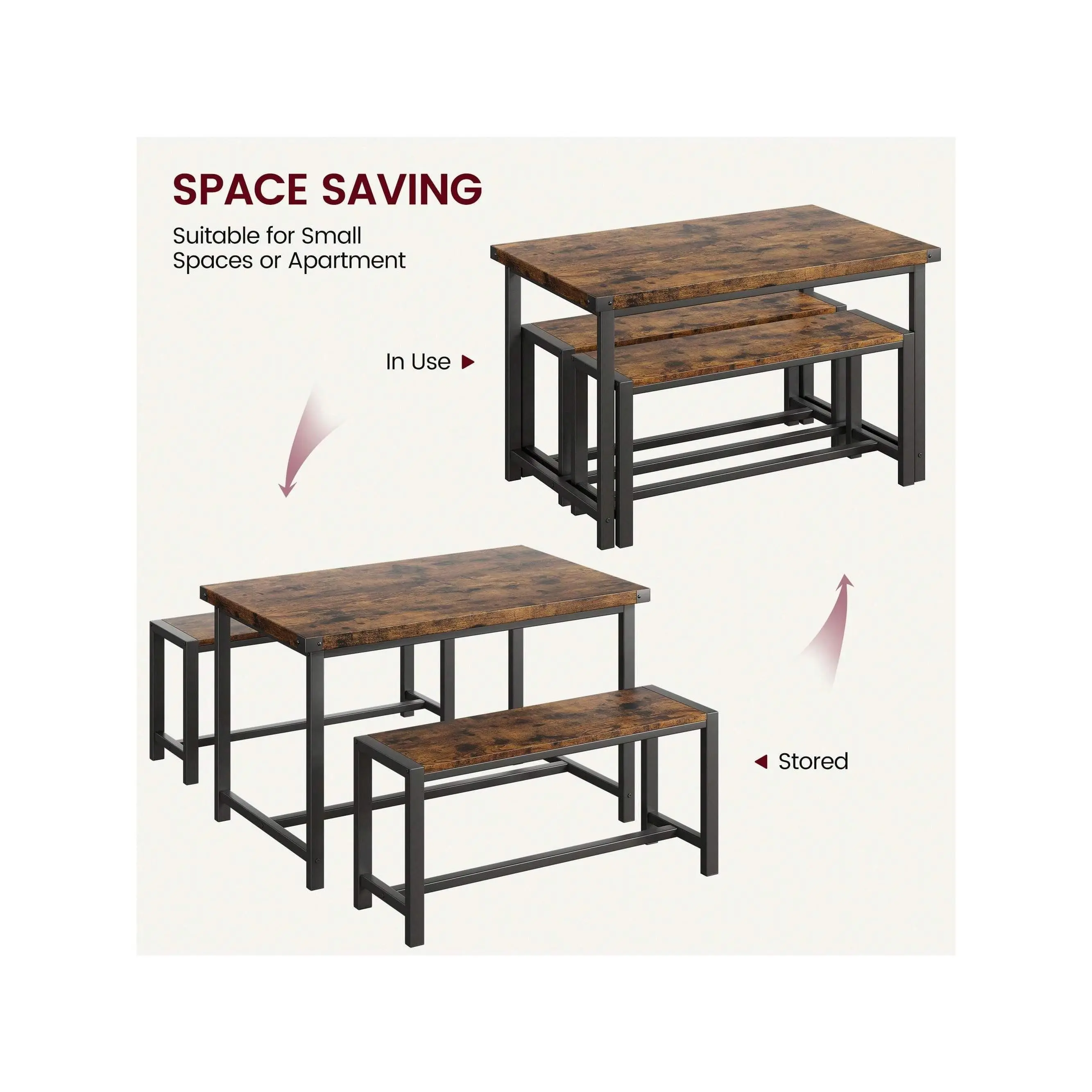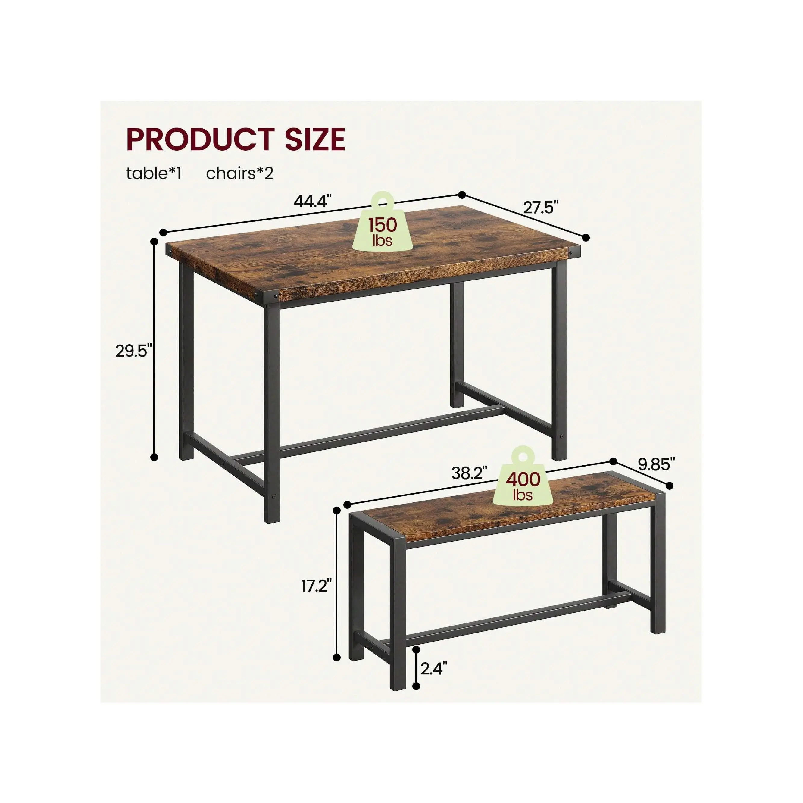 COZY BENCHES WITH STURDY FRAME: This dining table set is made of premium MDF board and solid steel, which features a sturdy frame for a long lifespan. The use of metal pipes with a larger diameter makes the dining bench more stable and comfortable than other products. The Upgraded Dining Bench seats are padded with thick MDF Boards, keeping you comfortable all dining time. PREMIUM & STURDY CONSTRUCTION: This rustic kitchen table set with a metal frame, which offers a longer service life and more excellent stability. With the premium thickening MDF Board top, the overall durability would be significantly increased. Protective iron plates have been added to the four corners of the desktop, making it more stable to use. SPACE-SAVING DESIGN: 2 kitchen benches can be hidden under the kitchen table to save space and create a tidy atmosphere. It is an excellent solution for small spaces, such as condos, kitchens, studios, or apartments. EASY TO MAINTAIN: The surface of the dining table set is a waterproof and anti-corrosive coating, you can easily wipe soup, sauce, and dust clean, and the surface will not be hurt, and is sturdy for long-term use. EASY TO ASSEMBLE: All the assembly hardware and tools come with this dining table set. With illustrated instructions, this table with bench dining set can be assembled within 40 min without effort. Dimensions: Table Size 44.4" L*27.5" W*29.5" H, Bench Size 38.2" L*9.85" W*17.2" H. apartment furniture small apartment furniture kitchen furniture apartment dining table farmhouse bench studio furniture farmhouse dining table set studio furniture apartment small dining table bench dining room sets wood dining table kitchen & dining room table 3 piece dining table set for small spaces