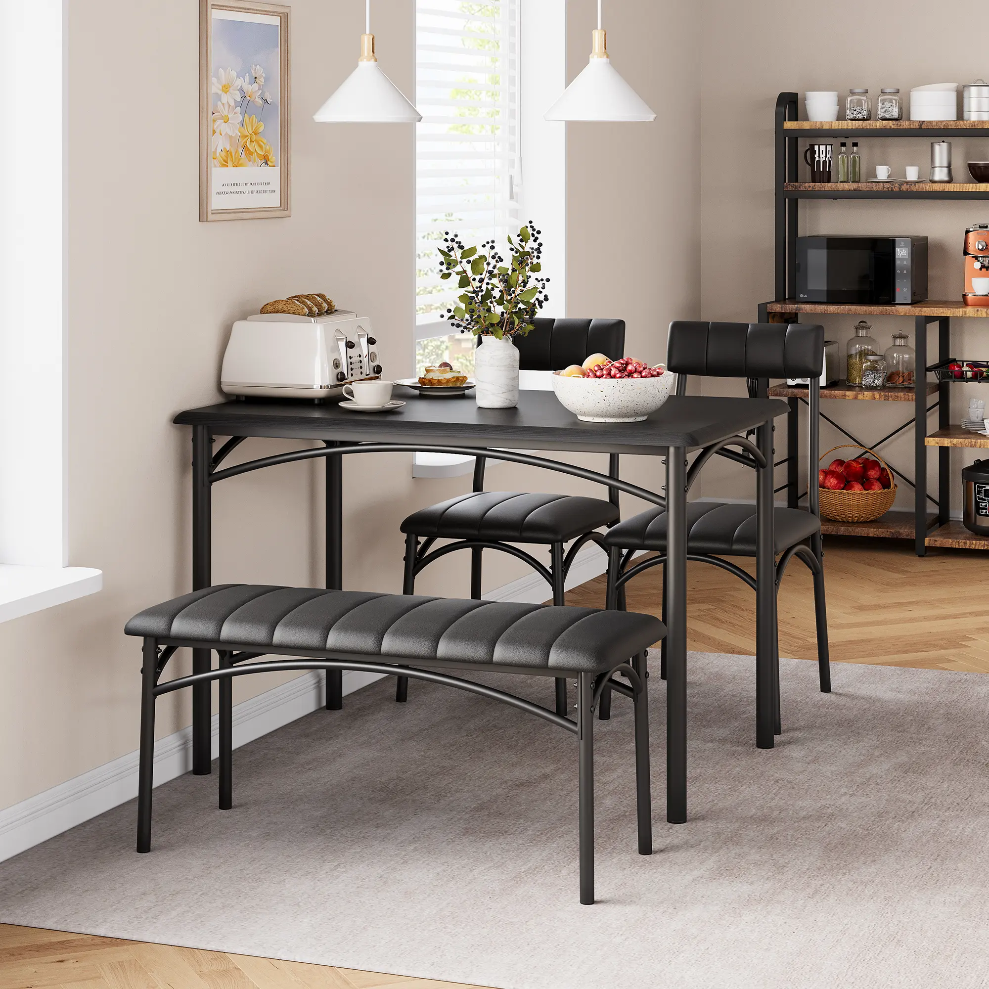Space-Saving Design: The 2 kitchen chairs and bench can be neatly stored underneath the kitchen table for space-saving convenience. The bench allows you to sit on it however you like and also serves as an entryway bench. It is an excellent solution for