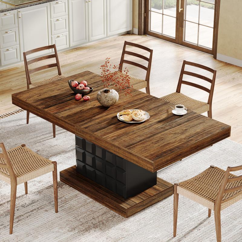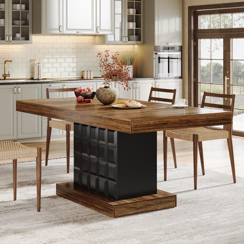 Refined Geometric Aesthetics: The dining table presents a sophisticated design with a brown tabletop and a standout cubed-patterned, black base adding richness and a modern vibe to your dining area