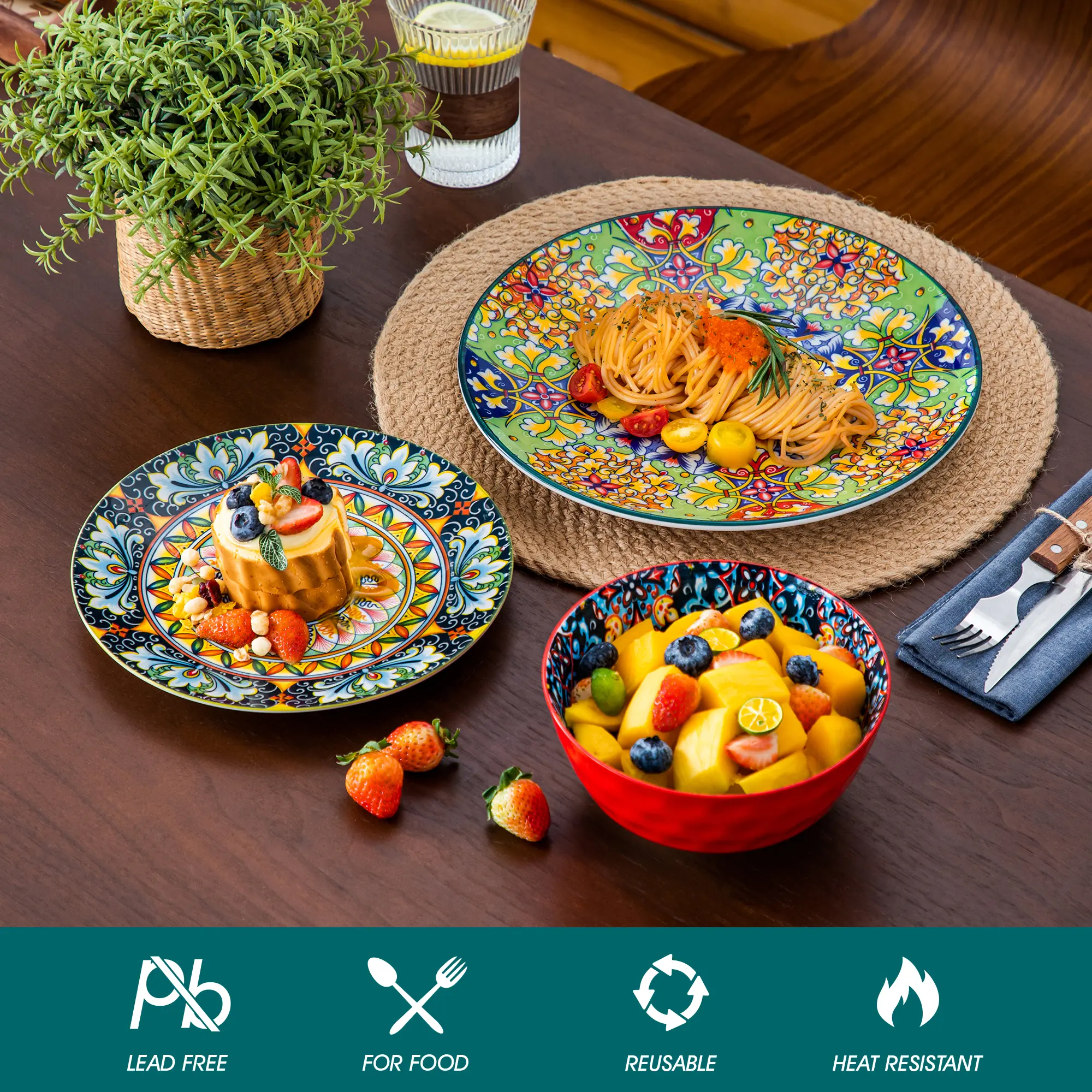 The dinnerware sets are made from Premium NON-LEAD and NON-CADMIUM ceramic, NON-TOXIC. The surface is solid and dense, will not be any chemical reaction with the food. Perfectly compatible with cold & hot food without worry about chips, nicks, cracks, and scratches.