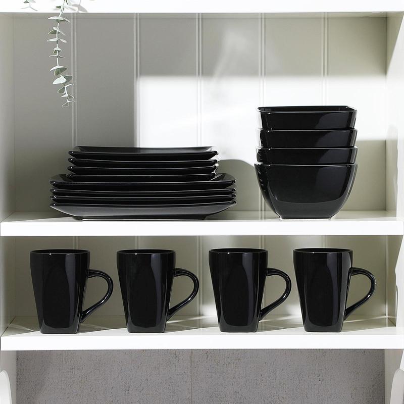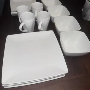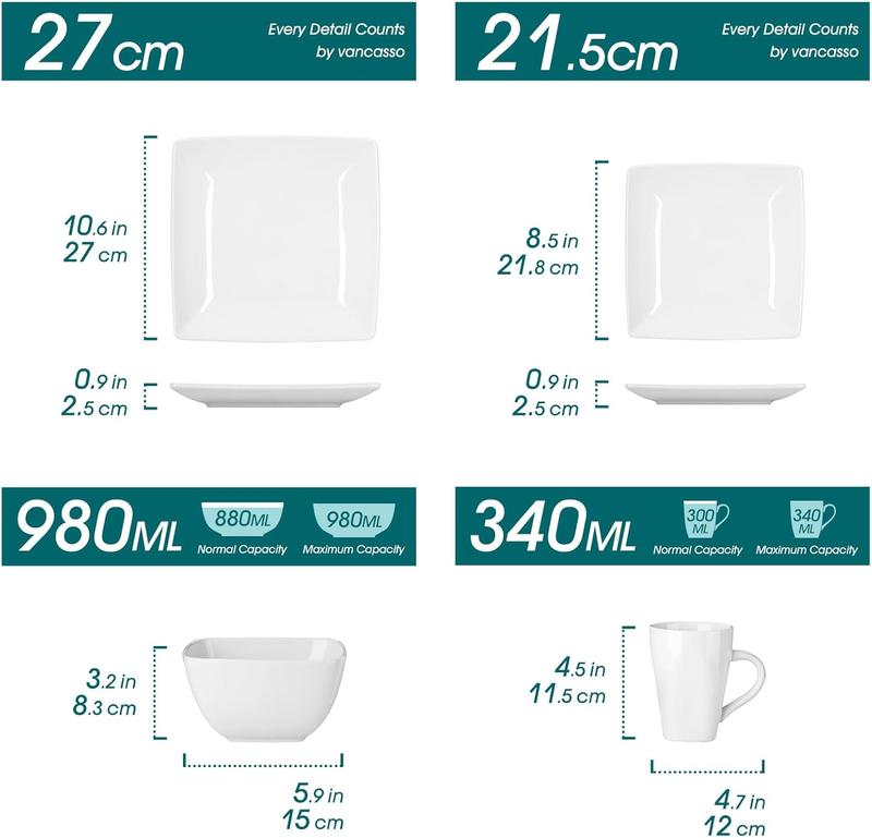 The square plates and bowls sets include 4 pieces 10.5 inch dinner plates, 4 pieces 8.58 inch dessert plates, 4 pieces 6 inch bowls, 4 pieces 11oz mugs. The dinner plate set wide enough to hold a variety of food. Excellent use at any family get-together, formal banquet or just for everyday use, Or an elegant gift for Thanksgiving & Christmas.