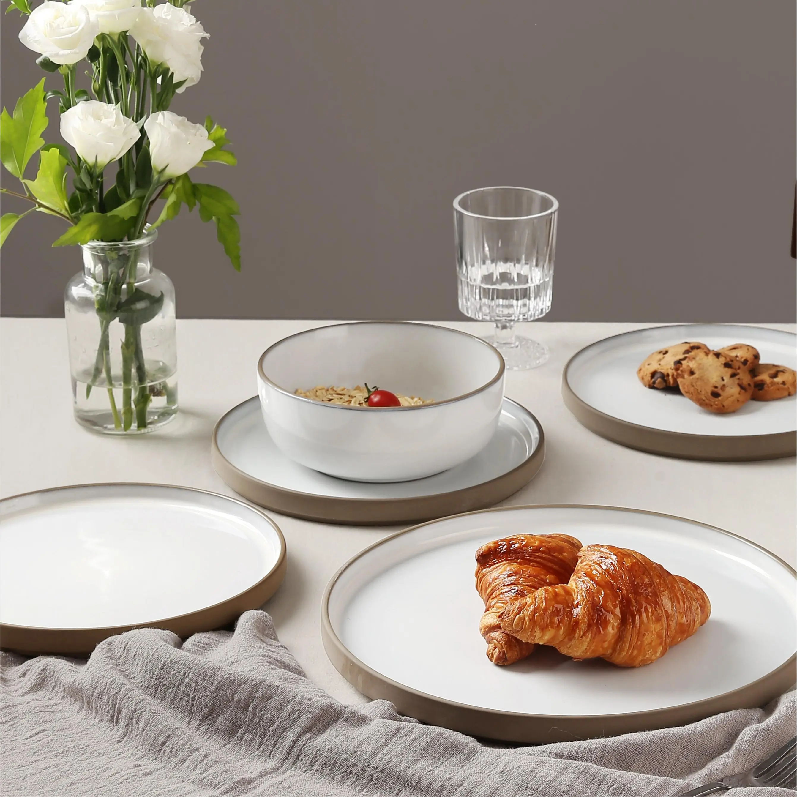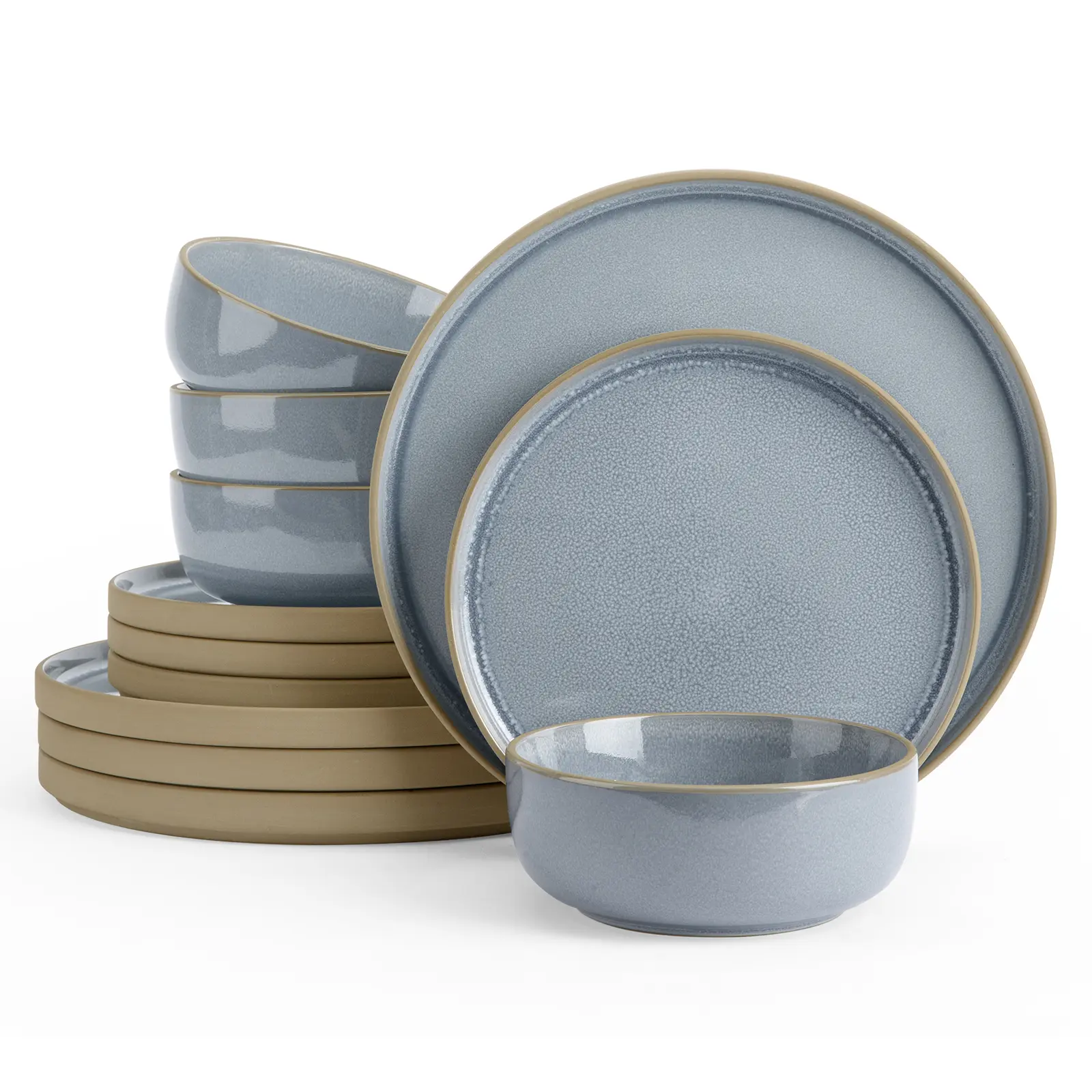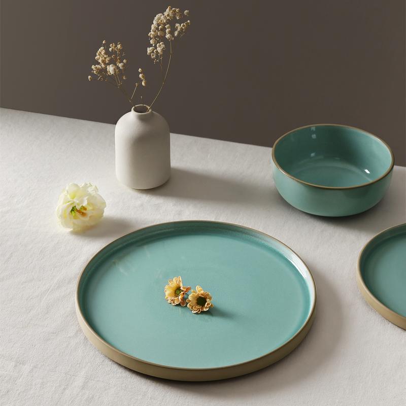 This 12-piece dinnerware set includes 4 dinner plates, 4 salad plates, 4 cereal bowls,catering to the needs of four individuals and perfect for everyday or casual dining. This tableware is designed with unglazed clay at the bottom and edge, which enhances the beauty of the set while achieving a harmonious fusion of appearance and function.Crafted from high-quality stoneware, these plates and bowls are strong and durable, with each dish being microwave and dishwasher safe, making heating and cleaning a breeze.