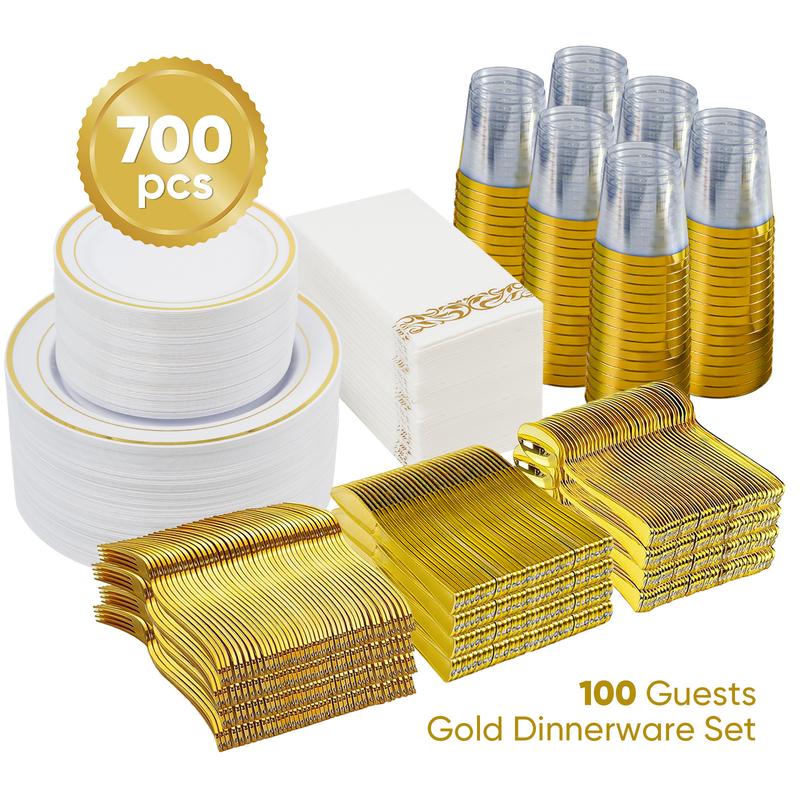 ·WHAT YOU GET: Our 700-piece disposable plastic utensils set is tailor-made for your 100-guest party.You will receive the 700 PCS disposable dinnerware set, including 100 clear gold dinner plates 10’’, 100 clear gold dessert plates 7’’, 100 gold plastic cups 10oz, 100 napkins,100 knives 7.8’’, 100 forks 7.4’’ and 100 spoons 6.8