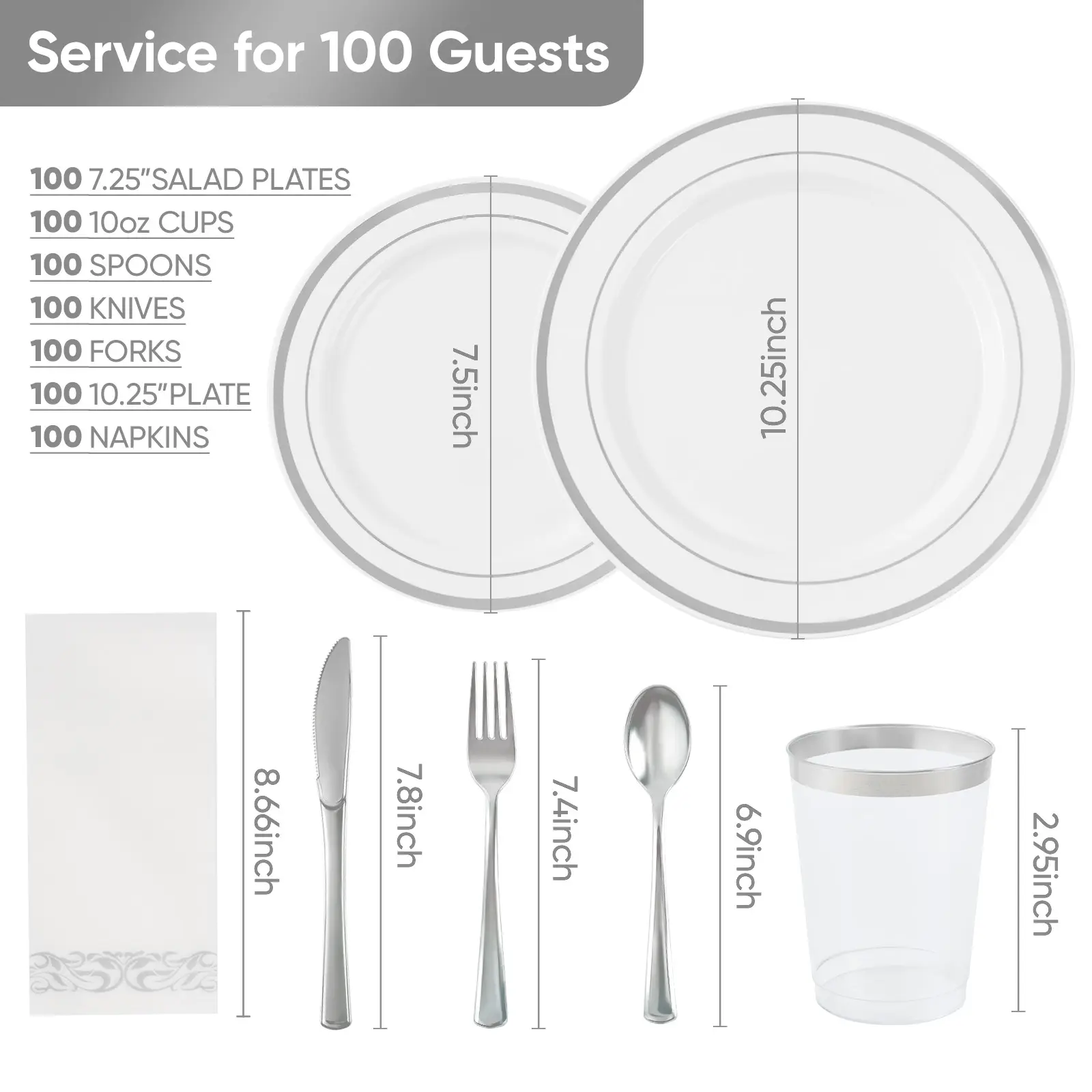 ·WHAT YOU GET: Our 700-piece disposable plastic utensils set is tailor-made for your 100-guest party.You will receive the 700 PCS disposable dinnerware set, including 100 clear gold dinner plates 10’’, 100 clear gold dessert plates 7’’, 100 gold plastic cups 10oz, 100 napkins,100 knives 7.8’’, 100 forks 7.4’’ and 100 spoons 6.8