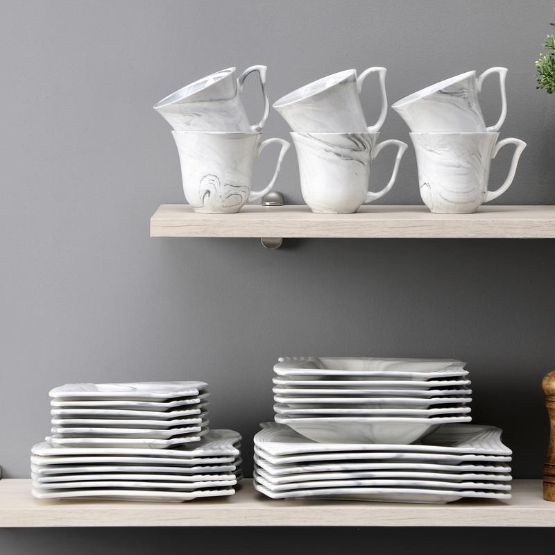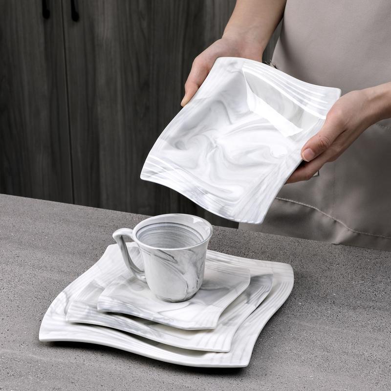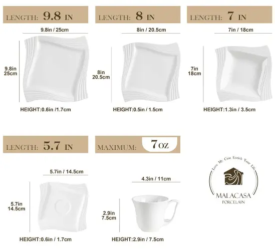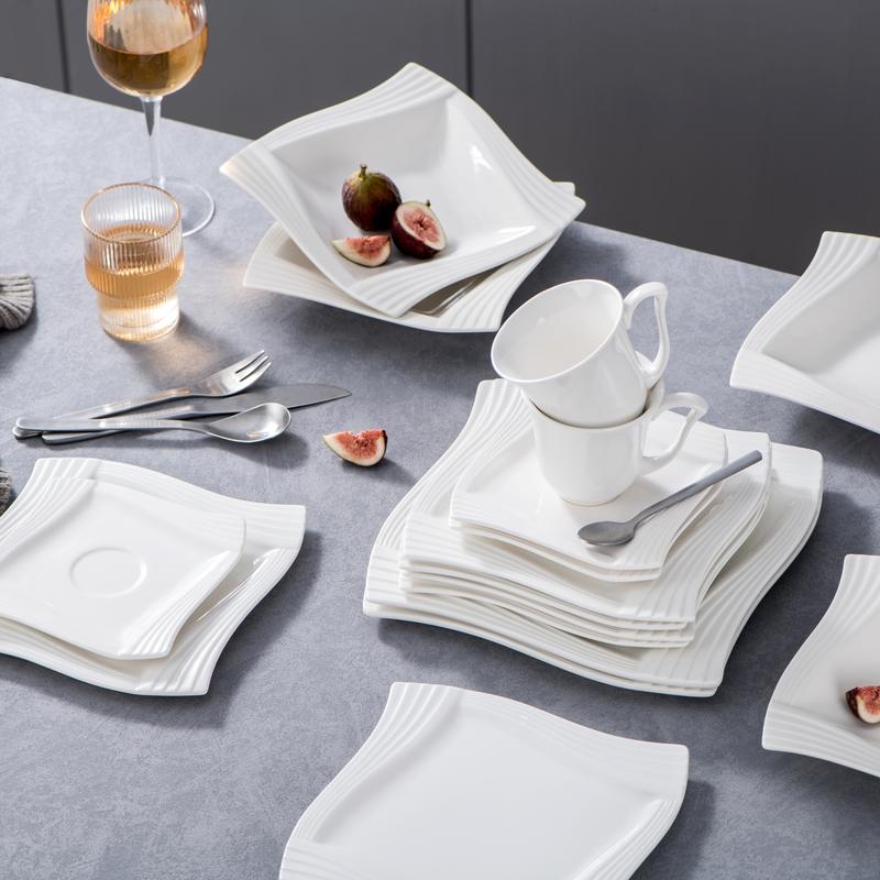 With a brighter surface, our dinnerware sets are made of durable porcelain, a type of premium LEAD-FREE and NON-TOXIC ceramic. 1300°C High-temperature firing makes the dishes set anti-chip, scratch resistant,easy to clean and maintain. Also, microwavable, oven and dishwasher safe.