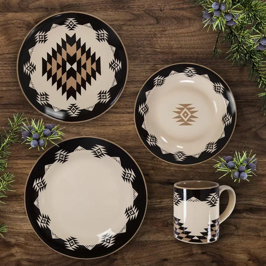 Inspire a modern Southwestern-inspired look for your dining table with our Chalet Aztec Ceramic Dinnerware Set. Adorned with bold geometric patterns in earthen tones, this set is ideal for both casual meals and elegant dinner arrangements. Its sophisticated color palette and rich ceramic glaze make it at home in any contemporary setting. One set works for four place settings.