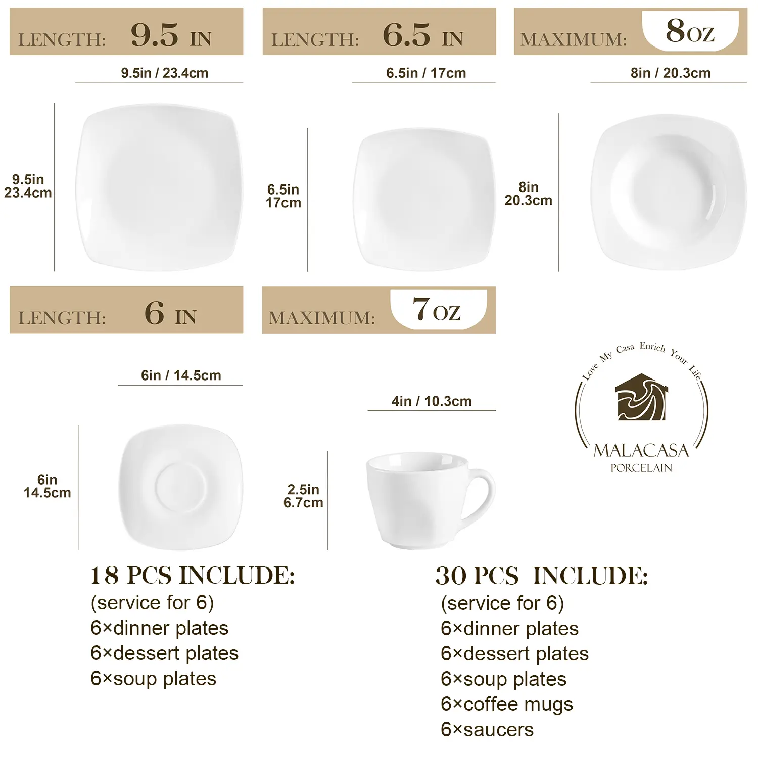 MALACASA Dinnerware Sets, Grey White Plates and Bowls Sets for 6, 18/30 Pieces Mordern Square Dinnerware Sets, Series Julia Winter Holiday