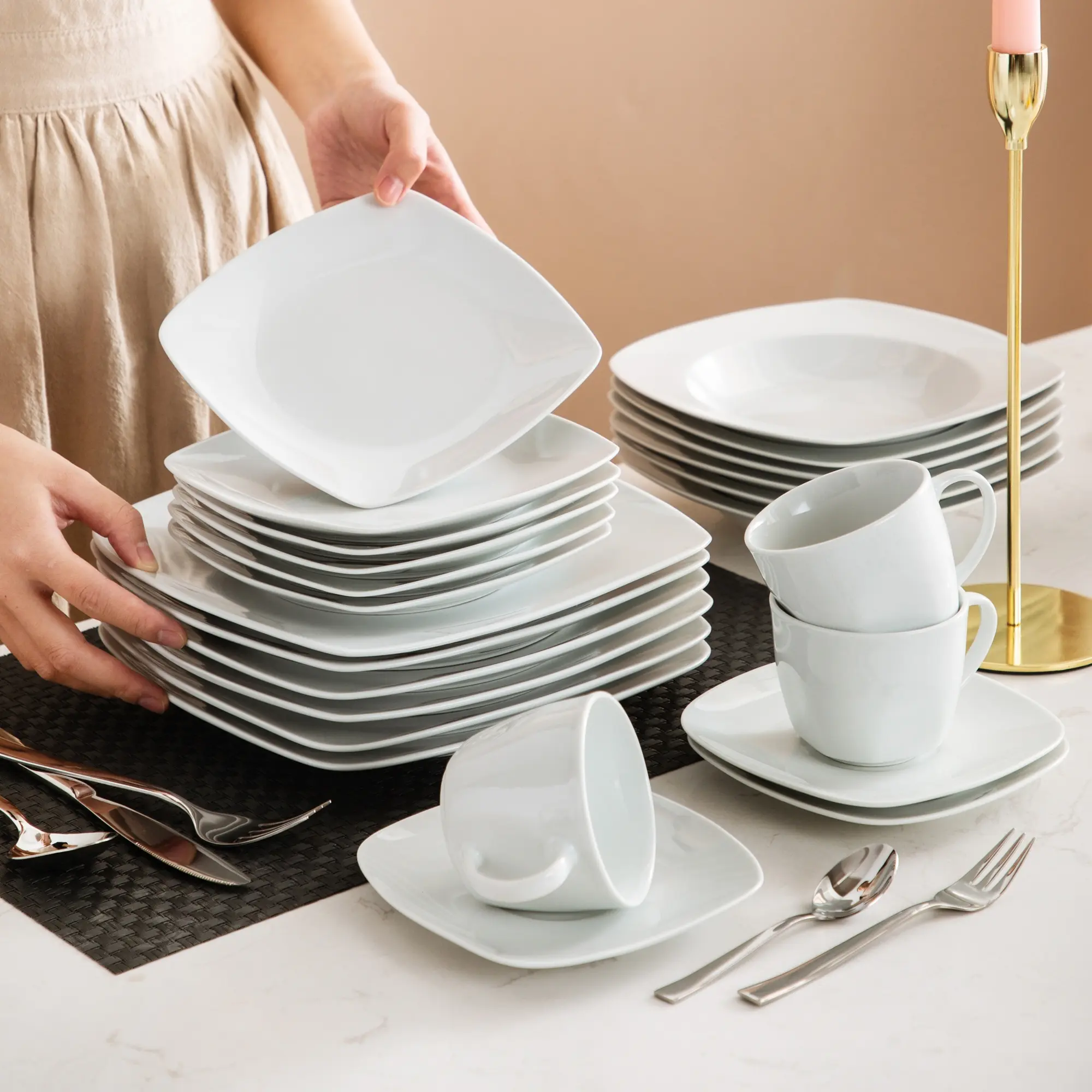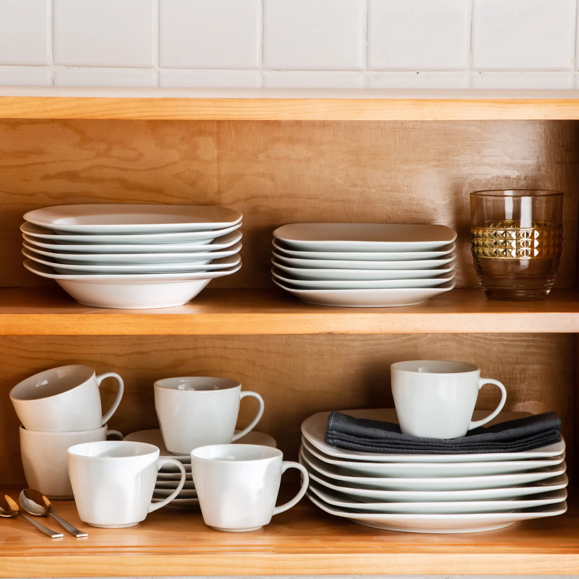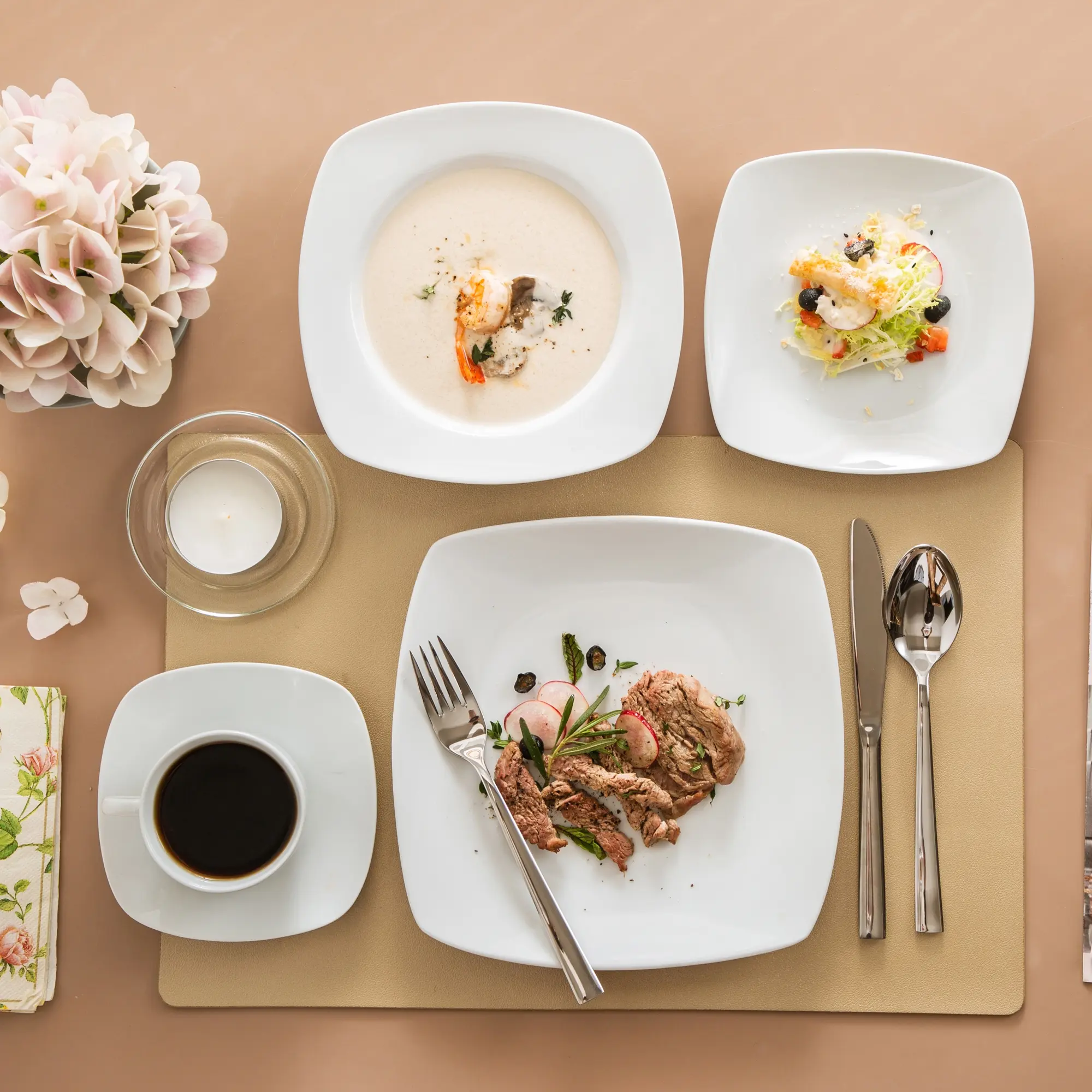 Our square dinnerware sets are made of premium porcelain and are non-toxic and safe for hot and cold foods and everyday dining. With a glossy beige finish and square and round designs, our dinner plate sets bring style to every kitchen and are perfect for casual or formal dining.
