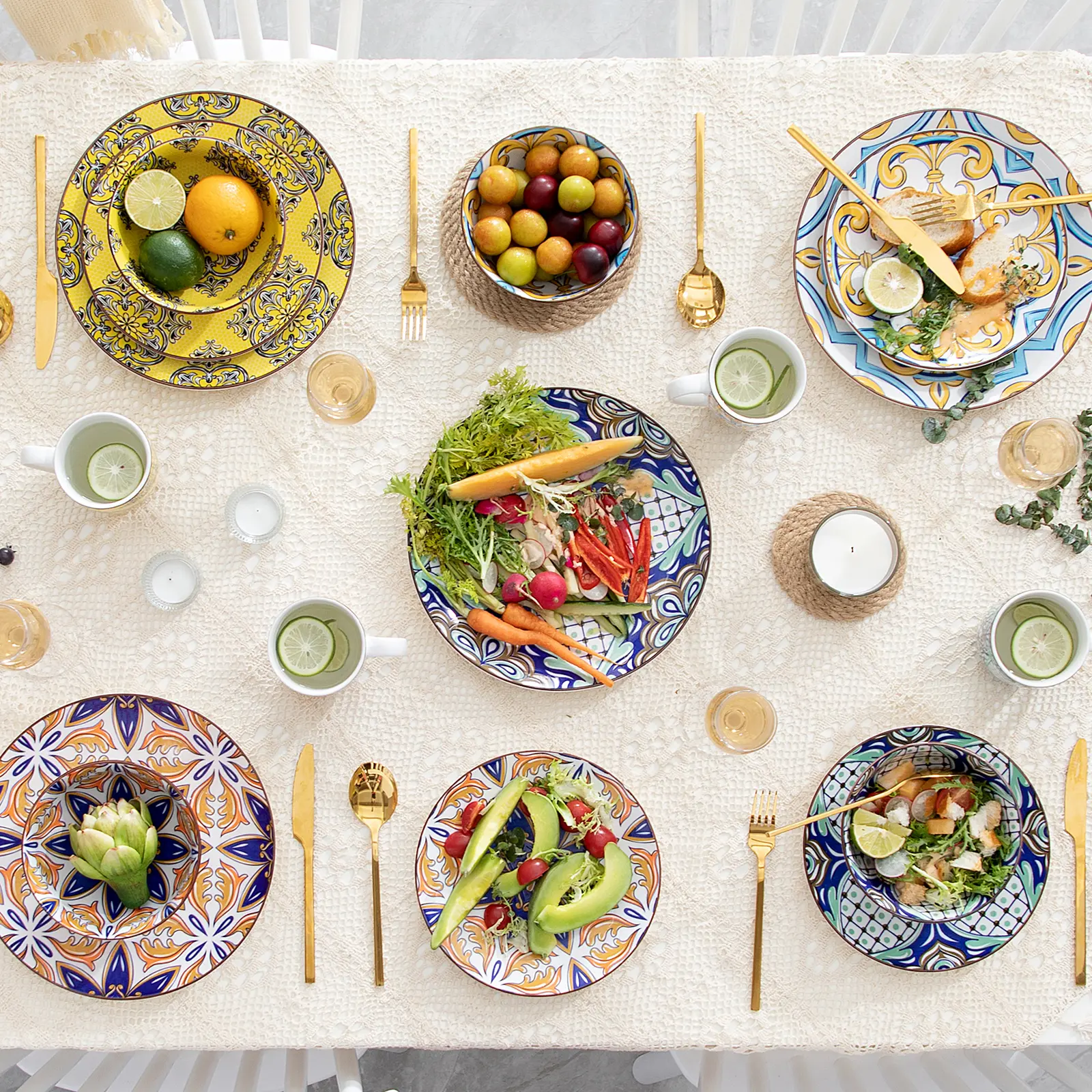 Inspired by oriental motifs, the Jasmin dinnerware set features beautiful pastel colors and four unique patterns that add a Moroccan touch to your table. The porcelain bowls are colored with inorganic pigments and produced at high temperatures, ensuring the colors remain vibrant and do not fade over time.