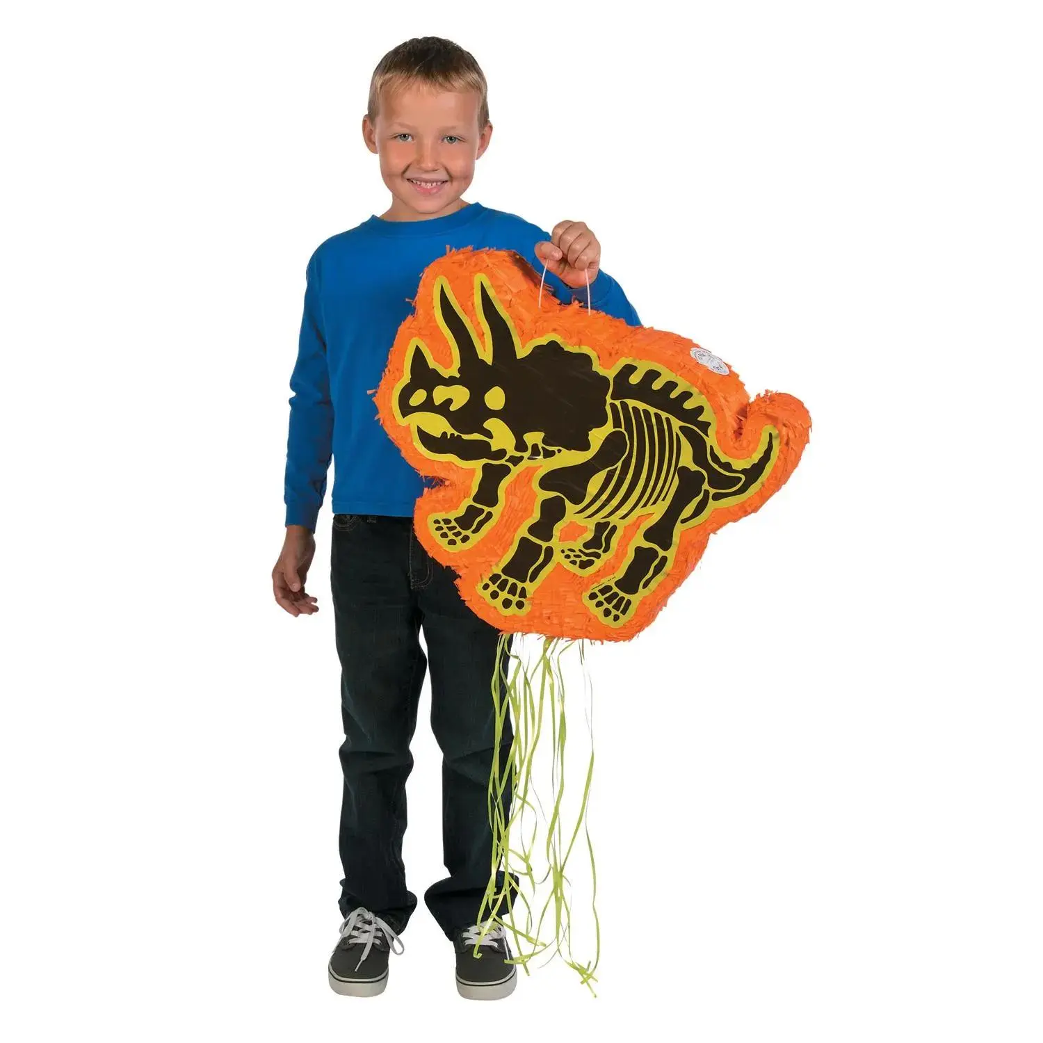 This piñata is dino-mite! Fill this dino piñata with your own treats and let kids pull the strings to see which one reveals a shower of sweets. It's a perfect party supply for a Dino Dig birthday party, Cinco de Mayo party or a neighborhood gathering. Piñatas are a quick and easy way to organize party favors - just pull the string and watch everyone scramble for goodies! Includes 4" hanger. Papier-Mâché. 20" x 16" Piñata toy & candy assortment sold separately. © OTC